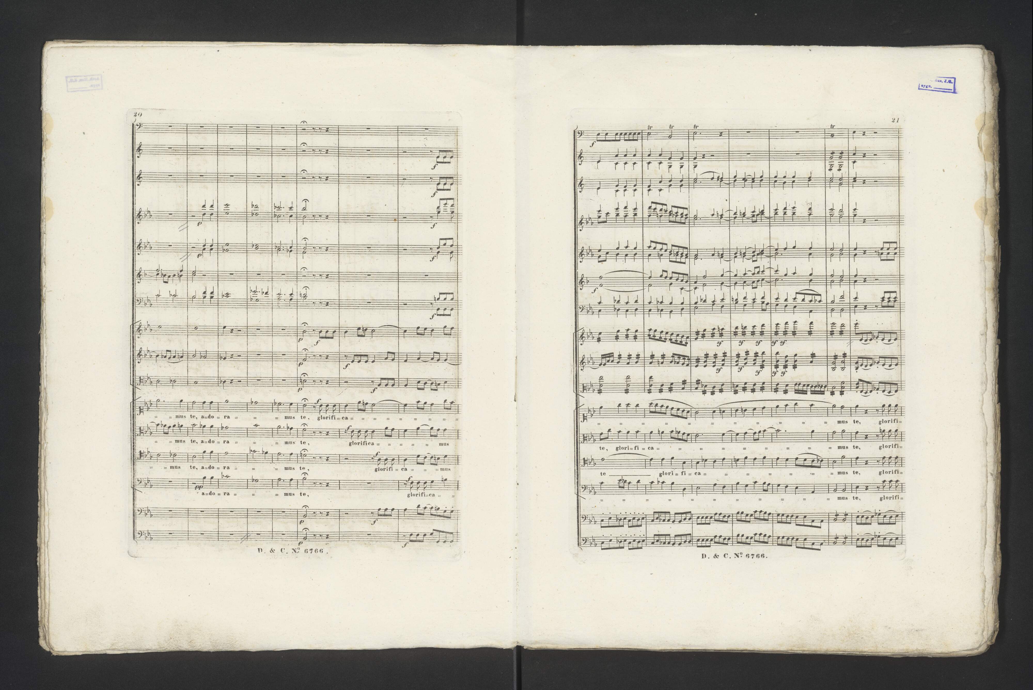 [title page:] 4|t|e Grosse | MESSE | in Es | für 4 Singstimmen | 2 Violinen, Viola, 2 Flöten, 2 Oboen, 2 Clarinetten, | 2 Fagotte, 2 Hörner, 2 Trompeten, Pauken, Violoncell | und Contrabass, | componirt, und | S|r Majestät dem Allerdurchlauchtigsten Herrn Herrn | FRIEDRICH AUGUST | KÖNIG von SACHSEN | etc. etc. etc. | in tiefster Ehrfurcht zugeeignetz | von | G. G. Reissiger, .| königl. sächs. Kapellmeister. | N|o 6766. Eigenthum der Verleger | Eingetragen in das Vereins-Archiv | WIEN, | bei Ant. Diabelli und Comp. Graben N|o 1133