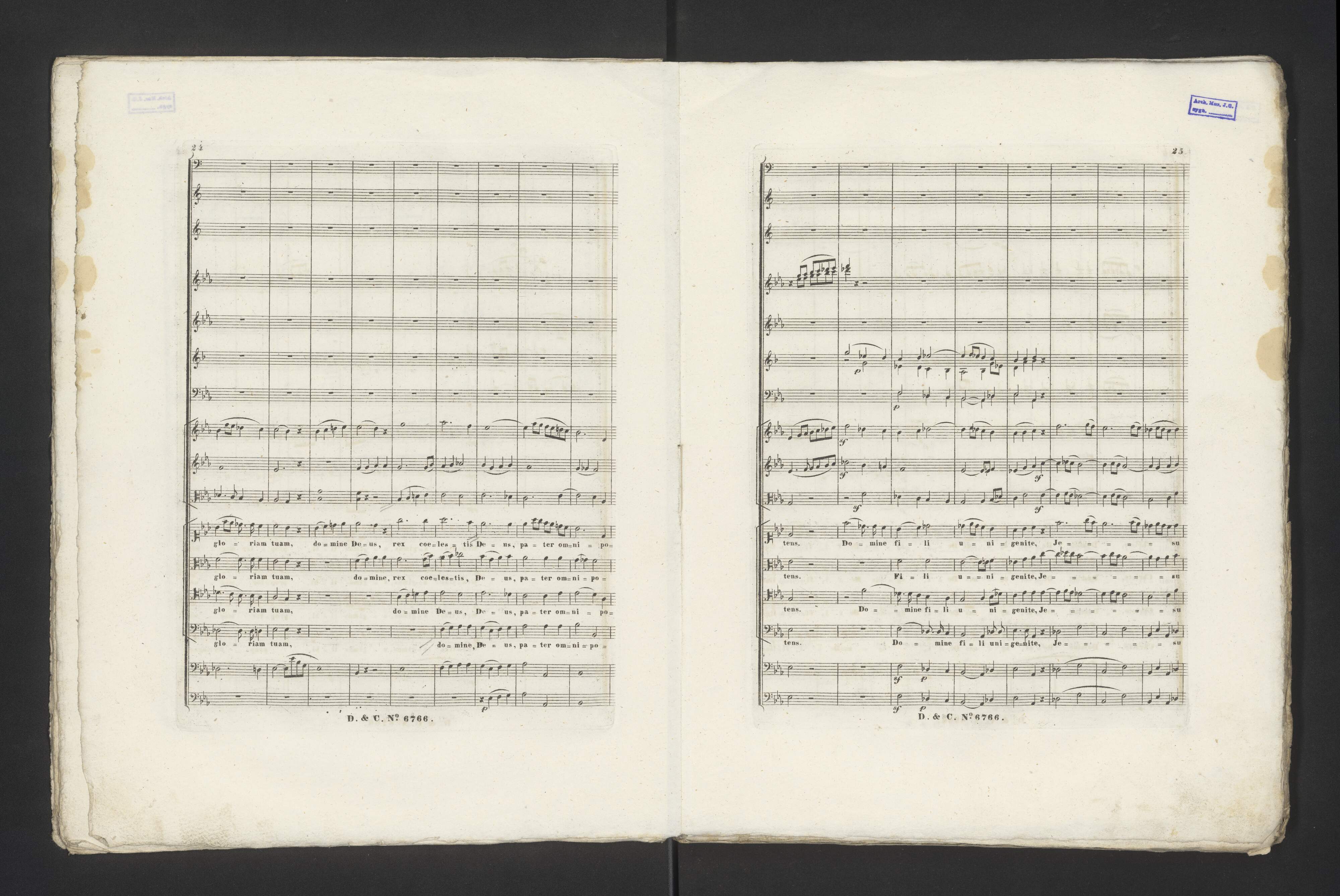 [title page:] 4|t|e Grosse | MESSE | in Es | für 4 Singstimmen | 2 Violinen, Viola, 2 Flöten, 2 Oboen, 2 Clarinetten, | 2 Fagotte, 2 Hörner, 2 Trompeten, Pauken, Violoncell | und Contrabass, | componirt, und | S|r Majestät dem Allerdurchlauchtigsten Herrn Herrn | FRIEDRICH AUGUST | KÖNIG von SACHSEN | etc. etc. etc. | in tiefster Ehrfurcht zugeeignetz | von | G. G. Reissiger, .| königl. sächs. Kapellmeister. | N|o 6766. Eigenthum der Verleger | Eingetragen in das Vereins-Archiv | WIEN, | bei Ant. Diabelli und Comp. Graben N|o 1133