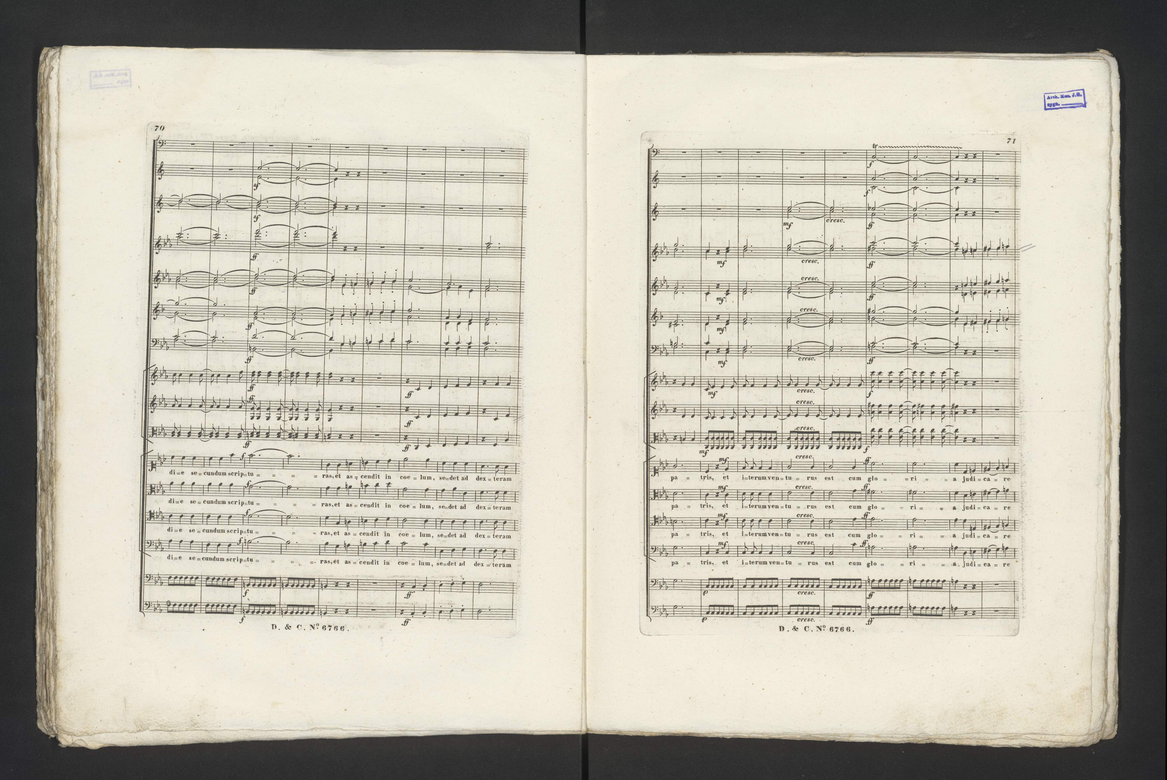 [title page:] 4|t|e Grosse | MESSE | in Es | für 4 Singstimmen | 2 Violinen, Viola, 2 Flöten, 2 Oboen, 2 Clarinetten, | 2 Fagotte, 2 Hörner, 2 Trompeten, Pauken, Violoncell | und Contrabass, | componirt, und | S|r Majestät dem Allerdurchlauchtigsten Herrn Herrn | FRIEDRICH AUGUST | KÖNIG von SACHSEN | etc. etc. etc. | in tiefster Ehrfurcht zugeeignetz | von | G. G. Reissiger, .| königl. sächs. Kapellmeister. | N|o 6766. Eigenthum der Verleger | Eingetragen in das Vereins-Archiv | WIEN, | bei Ant. Diabelli und Comp. Graben N|o 1133