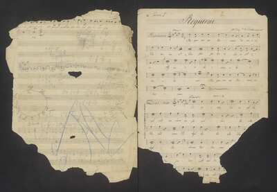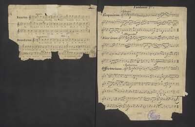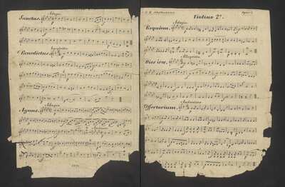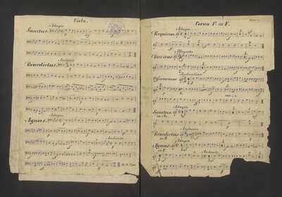 [pl-text: Informacje dotyczące miejsca wydania, wydawcy oraz daty zaczerpnięte z RISM ID 453012489], [pl-text: Karta tytułowa druku w RISM ID 453012489], [pl-text: Wcześniejsza sygnatura na f. 1r okładki: na środku po prawej ołówkiem ręką W. Świerczka "463" w owalnym kółku], [pl-text: Na f. 1v okładki ołówkiem: "Ksiądz Jozef umarł dnia 15 [?] / VIII 1910 r."; na f. 2r okładki ołówkiem: "Błasikiewicz Heneczkowski Wopa[liński] | Organowski | Bednarek Kurkowski Skępiec | Orgamowski | Hudzik Raczyński | Biasikiewicz, Henecz:[kowski] Wopalin[ski] | Policinski, Nanys, Cybulski"], [pl-text: Drukowana partia Solo and Coro T - uszkodzona, zachowana górna połowa karty], [pl-text: Na f. 2v okładki, f. 1r partii vl 1 oraz f. 1v partii vla okrągła pieczęć tuszowa fioletowa; otok: [gwiazdka] ARCHIVUM [gwiazdka] C. M. C.; pole: [herb Zakonu Ojców Paulinów]] 51044953, [pl-text: Na f. 1v partii: Solo and Coro T, vl 2; na f. 1r partii: cor 1, 2, Solo and Coro: S, T 1 (x2), b(1) fioletowa pieczęć tuszowa: ARCH. J. G.] 51044953