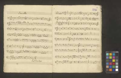 [pl-text: Brak partii vl 1], [pl-text: Grzbiet głosu b podklejony fragmentami rękopisów muzycznych], [pl-text: Na karcie tytułowej u góry na środku "N 58" (ręką nieznanego Paulina), na f. 28r "N|o 67." (ręką nieznanego Paulina); z lewej u góry sygnatura czerwonym tuszem "N 187" (przez F. Maletza)], [pl-text: Na karcie tytułowej u góry po prawej granatowa pieczęć "*ARCHIVUM * C.M.C."], [pl-text: Na f. 1v notatka ołówkiem ręką P. Podejki: "Grzbiet okładki usztywniał | fragment ob.I mszy in D | nieznanego komp."], [pl-text: Na stronie verso karty tytułowej wklejona karta tytułowa zidentyfikowanego utworu z PodejkoK 1992, no.1787], [pl-text: f. 7 przerwane na pół], [pl-text: W PodejkoK 1992 podany jest kopista manuskryptu, brak o nim informacji na manuskrypcie], [pl-text: W MaletzC 1898 manuskrypt zapisany jako Ouvertura pod sygn. "1569/187."], [pl-text: Paginacja w prawym górnym goru każdego z folio ołowkiem]
