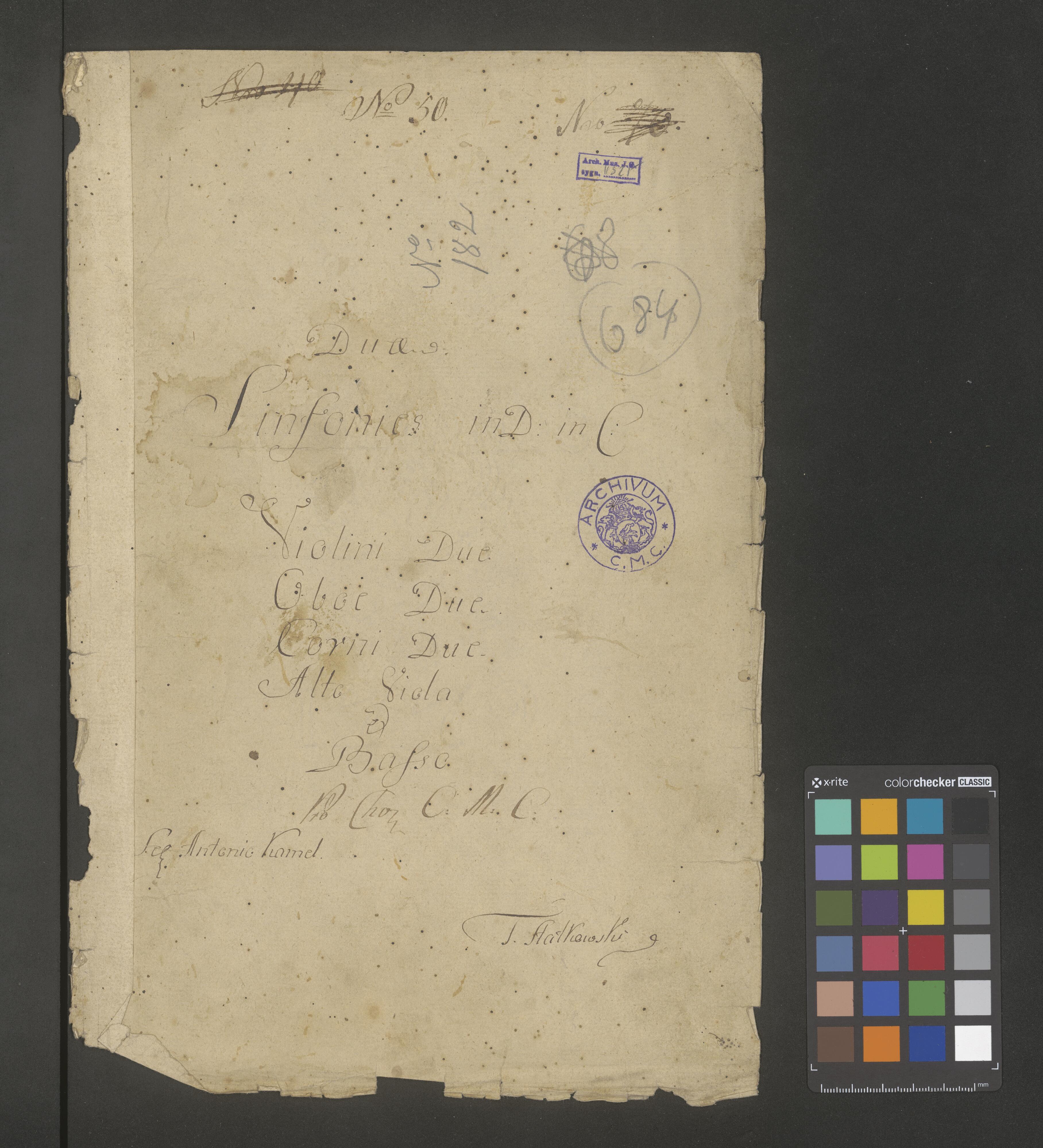[cover title:] Duae | Sinfonies in D: in C: | Violini Due | Oboe Due | Corni Due | Alto Viola | et | Basso. | [later by other hand:] Pro Choro C: M: C: | [at left:] Sige. Antonio Kamel. | [bottom right:] T. Statkowski