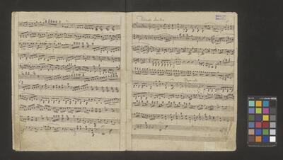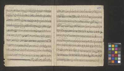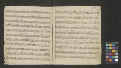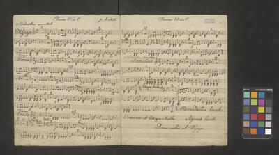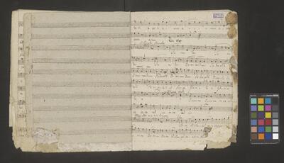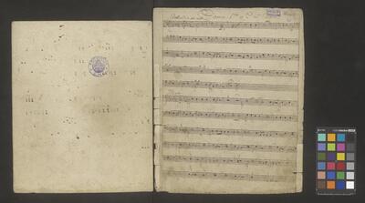 [pl-text: Na obwolucie dawne sygnatury: na środku u góry "N 365" zapisana przez F. Maletza czerwonym tuszem; u góry po lewej "908" w kółku zapisana ołówkiem, sporządzona przez ks. W. Świerczka], [pl-text: Na karcie tytułowej na środku po prawej granatowa, okrągła pieczęć "* ARCHIVUM * C.M.C."], [pl-text: Strona tytułowa ręką Mężnickiego], [pl-text: Pourywane fragmenty papieru f. 1, 2, 4, 10 oraz 49 - niewidoczna część materiału melodycznego], [pl-text: Wyblakły/zalany prawy dolny róg f. 16 - niewidoczna część materiału melodycznego], [pl-text: Na f. 11r na dole ołówkiem dopisany materiał melodyczny; Na f. 47v czarnym tuszem na dole dopisany materiał melodyczny], [pl-text: Na f. 30r, 34r, 38r, 40r, 42r, 44r u góry na środku czarnym tuszem "Dritte Landmesse in G von A. Diabelli 109 Werk"], [pl-text: Na f. 15r, 21v, 47r skreślenia/korekty], [pl-text: Na f. 49r w lewym górnym rogu ołówkiem równanie matematyczne], [pl-text: Paginacja w prawym górnym rogu, ołówkiem na każdym folio]