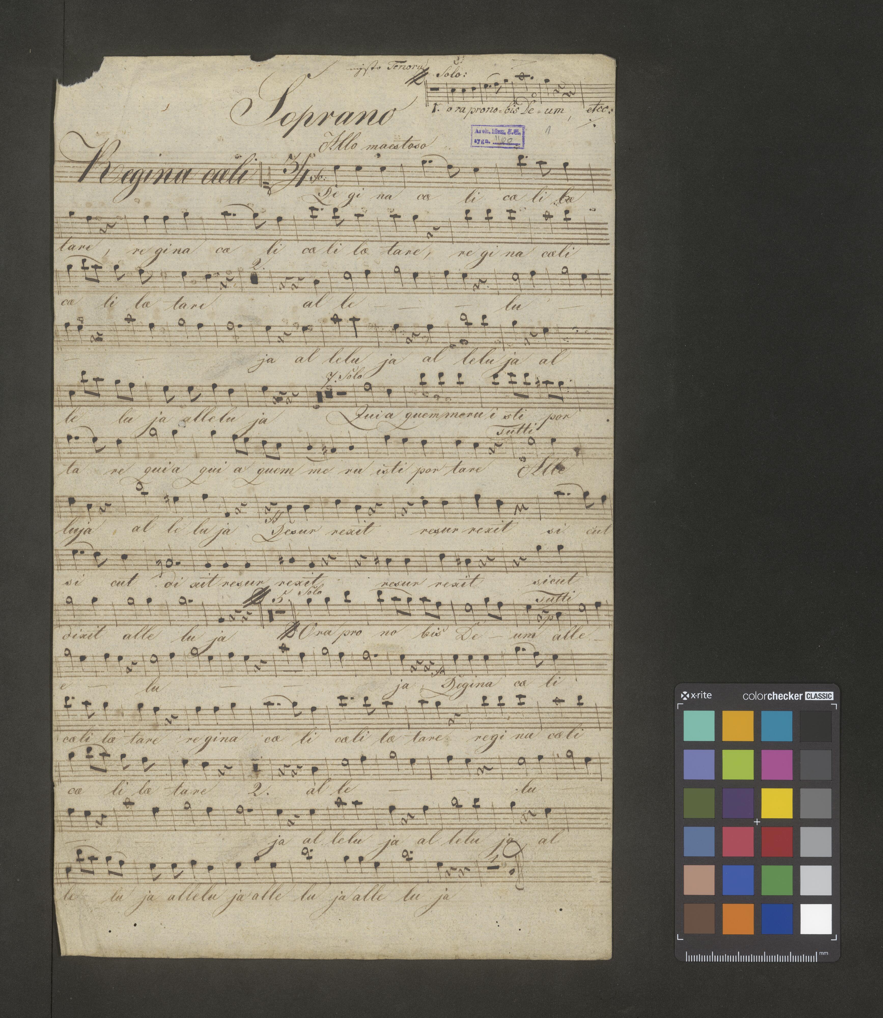 Regina coeli in C | mit Begleitung | Sopran, Alto, Tenore et Bass | zweyer | Violinen | Viola | 2. Clarinetten | 2. Trompeten und | Pauken | Fagott et | Orgel | Author Ferd: Schubert. | Kautny. 1830