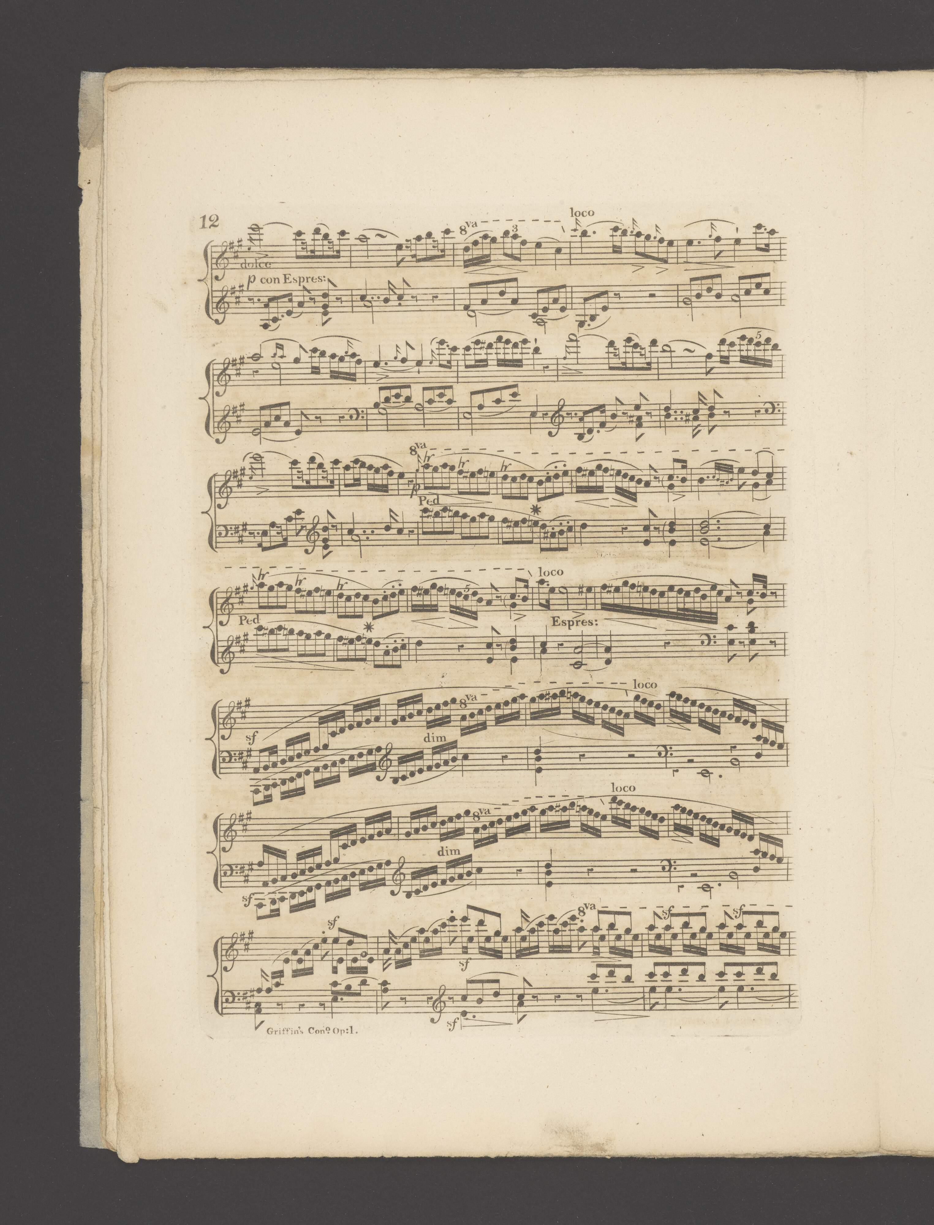 [cover title:] CONCERTO | N|o. 1. | for the | Piano Forte, | With Accompaniments for a | FULL ORCHESTRA | Composed | And Dedicated to | M.|r J. B. Cramer. | BY | G. E. GRIFFIN. | Op: 1. | London. | Printed for the Author, Northumberland Street: | Published by the same Author, A Second & a Third Concerto Price cach 10,,6. | R&E Williamsen, Se.S.Breck S'.West Sq.|e [on the left side] Ent.|d at Sta. Hall. [on the right side] Price 10,,|s 6.|d | without Accomp.|ts 6,, 6