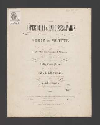 [pl-text: Strona tytułowa; s.2: pusta s.3-8 partytura.], [pl-text: Na dolnej okładce: Catalogue des Paroises de Paris publié par Régnier-Canaux.], Title page; p.2: blank. p. 3-8: score., [pl-text: Na pierwszej stronie partytury i ostatniej stronie zbioru niebieska owalna pieczęć tuszowa: otok: „* BIBLIOTEKA * CZARTORYSKICH”, pole: „XX.”] 51039891, [pl-text: Na obwolucie prostokątna naklejka z herbem Czartoryskich, otok: „BIBLIOTHECA CZARTORYSCIANA CRACOVIAE”] 51039891, [pl-text: Na karcie tytułowej owalna pieczęć: otok: “R. DE MEZIERES 1. PRES S|T SULPICE | CL-DE VANT. R.S|TE APPOLINE. 17 | A PARIS” pole: “Regnier Canaux” 51039891