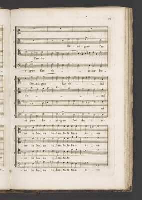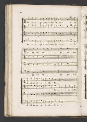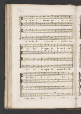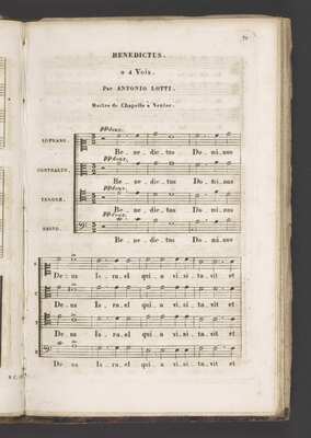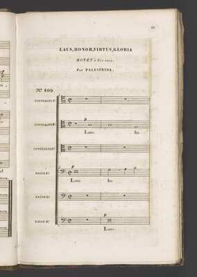 Dies sanctificatus, motet ; Sicut cervus, motet ; Même morceau en La bemol ; Laus honor virtus gloria, motet ; Veni sponsa Christi, motet / Palestrina. O quam gloriosum, motet ; Vere languores, motet / Vittoria. Miserere ; Benedictus / Lotti Antonio. Fragm. d'un ancien Noël français. Noël, noël ; Se questa valle di miseria, lodi spirituali du 16.me siècle / Anonim. / Eustache du Cauroy. Villote napolitaine / B. Donato. Viver lieto voglio / Gastoldi., [pl-text: Na obwolucie dwie prostokątne naklejki z herbem Czartoryskich, otok: „BIBLIOTHECA CZARTORYSCIANA CRACOVIAE”] 51041854, [pl-text: Na pierwszej stronie partytury i ostatniej stronie zbioru niebieska owalna pieczęć tuszowa: otok: „* BIBLIOTEKA * ] 51041854