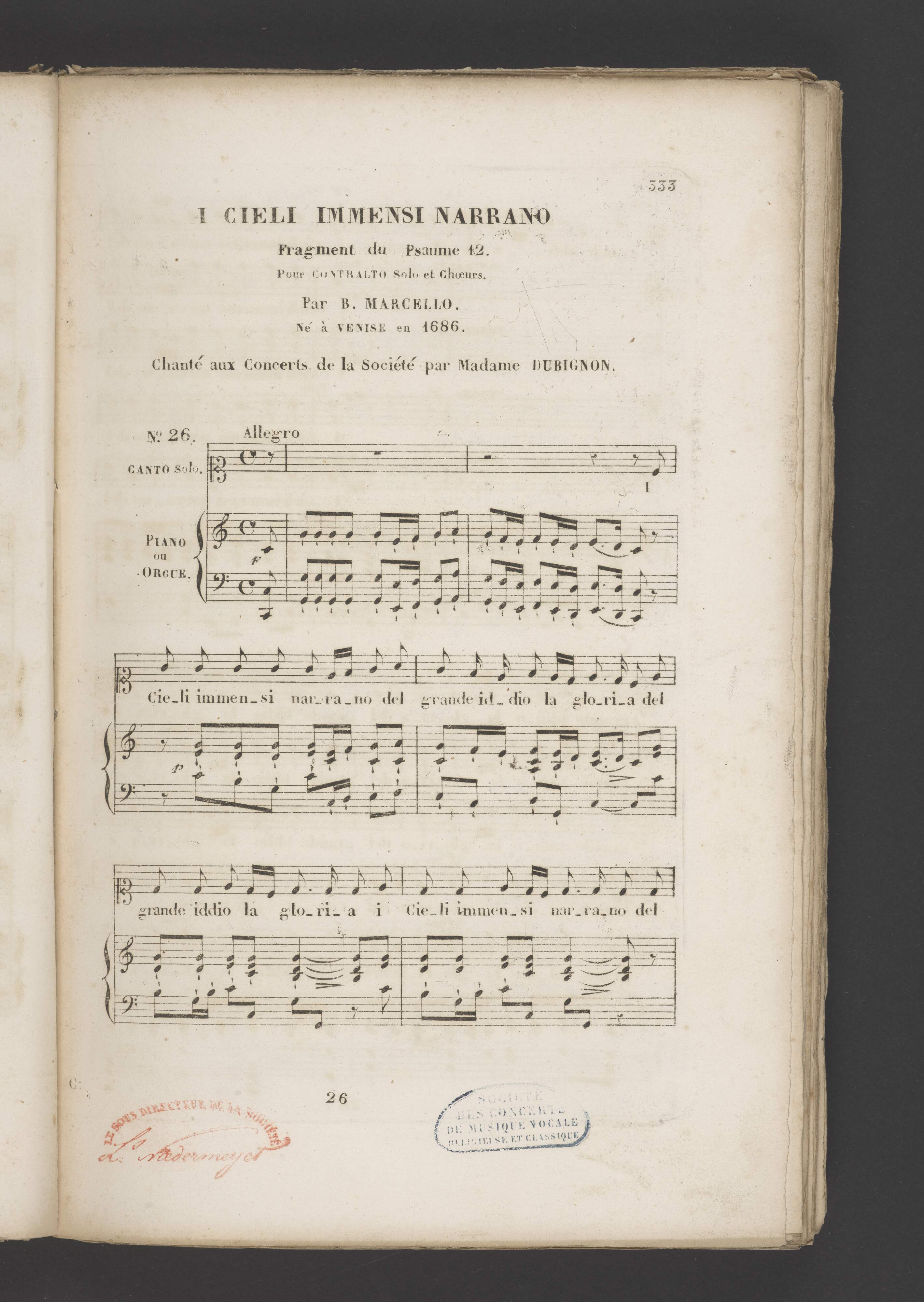 [cover title:] RECUEIL | DES | MORCEAUX DE MUSIQUE ANCIENNE, | Executés aux Concerts | de la Société de Musique | VOCALE RELIGIEUSE et CLASSIQUE, | FONDÉE A PARIS EN 1843. | SOUS LE PATRONAGE DE MESDAMES: | [list of patrons] | Et sous la Direction | de M|r LE PRINCE DE LA MOSKOWA. | Publié par la Société