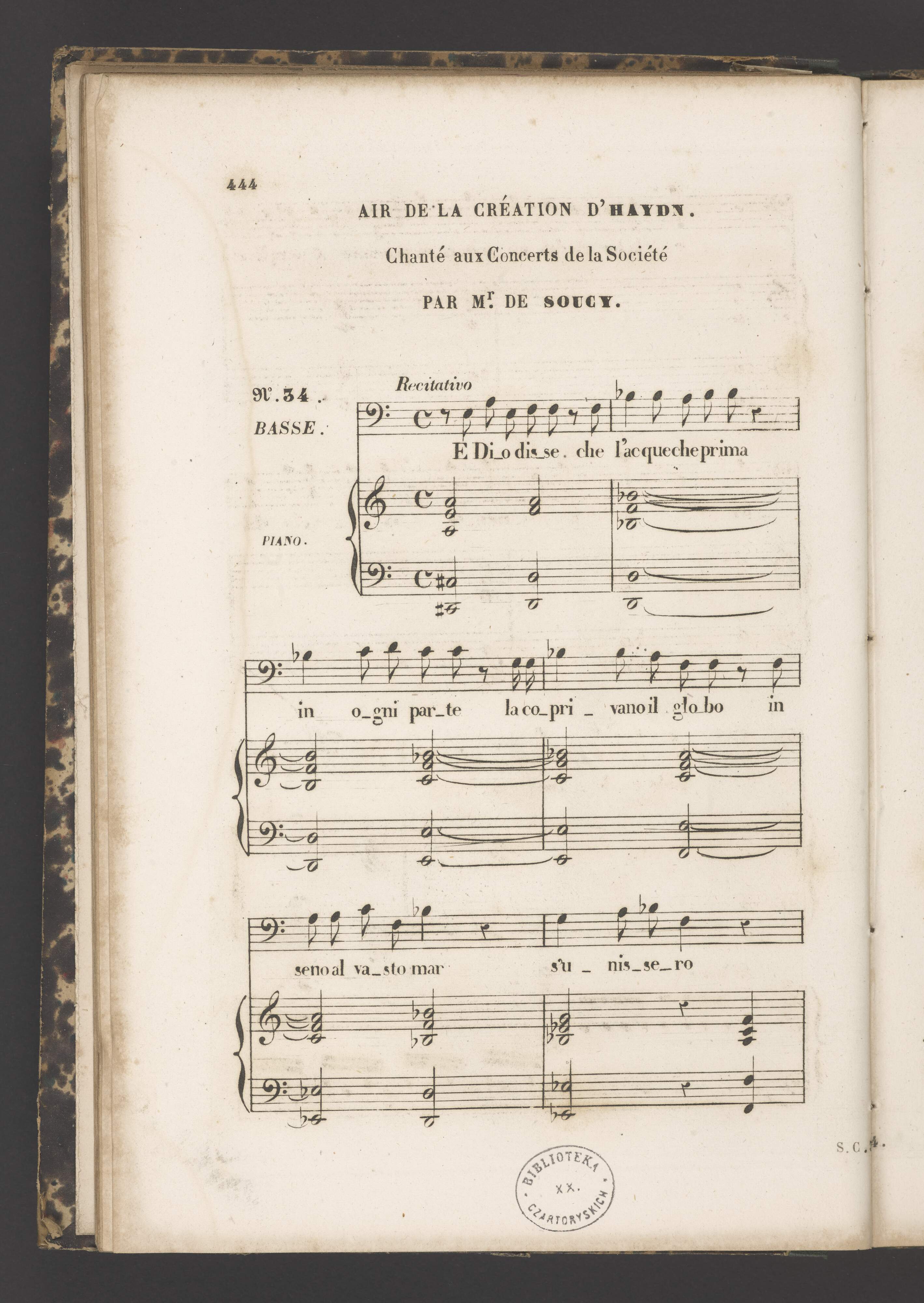 [cover title:] RECUEIL | DES | MORCEAUX DE MUSIQUE ANCIENNE, | Executés aux Concerts | de la Société de Musique | VOCALE RELIGIEUSE et CLASSIQUE, | FONDÉE A PARIS EN 1843. | SOUS LE PATRONAGE DE MESDAMES: | [list of patrons] | Et sous la Direction | de M|r LE PRINCE DE LA MOSKOWA. | Publié par la Société. | imp. Bertants [space] R. S|t Marc. 14 | Paris, chez Pacini Editeur des Œ|vres de la Société. | Boulevart des Italiens, N|o 11