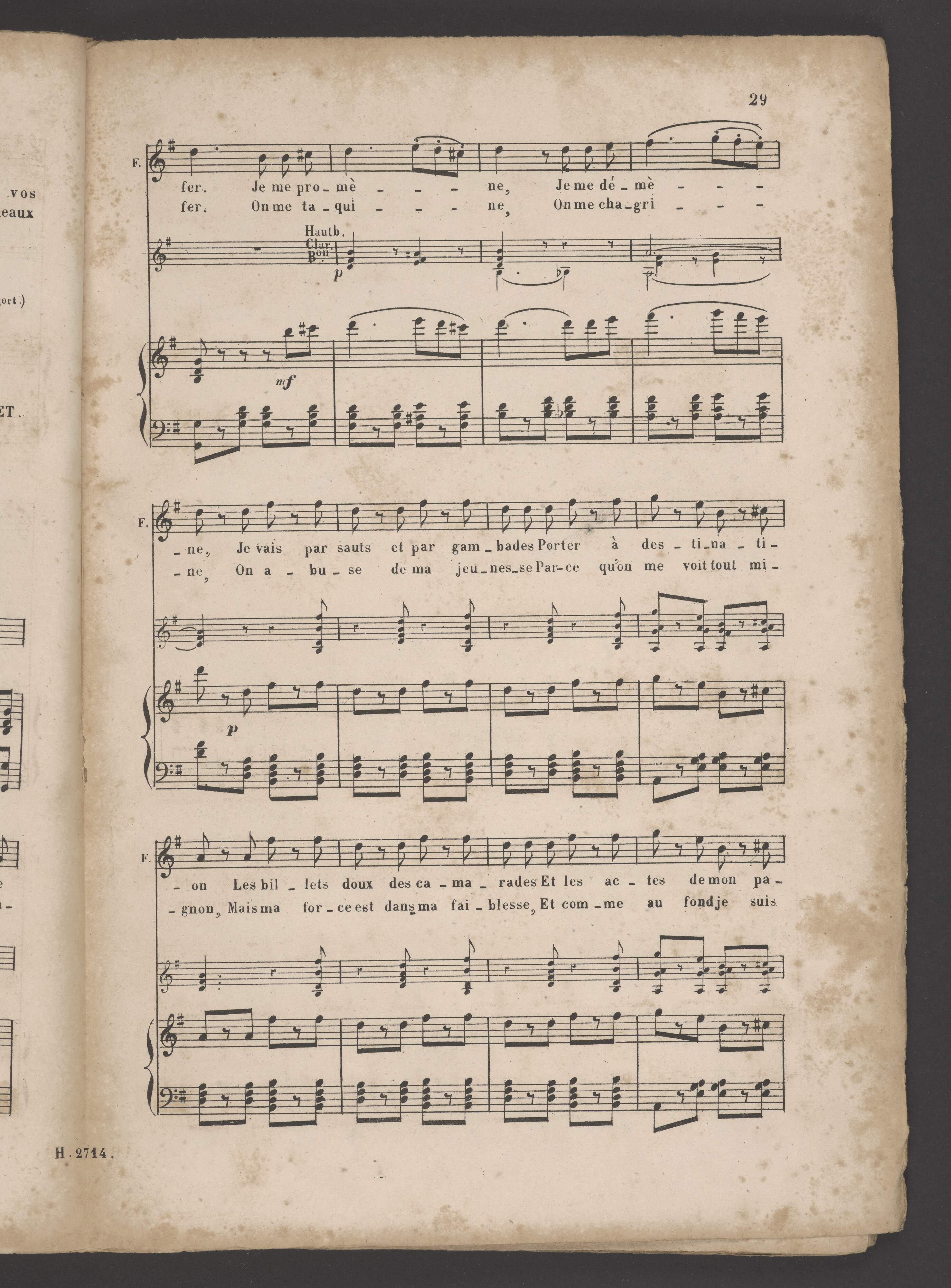 [cover title:] LA | CHANSON | DE | FORTUNIO | Partition | DE | J. OFFENBACH | A.V. | PRIX 7|F NET. [page title:] BOUFFES PARISIENS | LA | CHANSON | DE | FORTUNIO | OPÉRA COMIQUE EN UN ACTE, | Paroles de MM | Hector Crémieux et Ludovic Halévy, | MUSIQUE | DE | J. OFFENBACH. | PARTITION CHANT ET PIANO | PRIX 7|F NET. | A.V. | Paris, au MÉNESTREL, RUE Vivienne, 2 bis, | HEUGEL et C|I|E | Editeurs Libraires p|r la France et l’Etranger. | Berlin, Bote et Bock