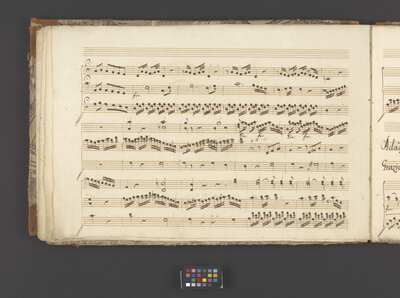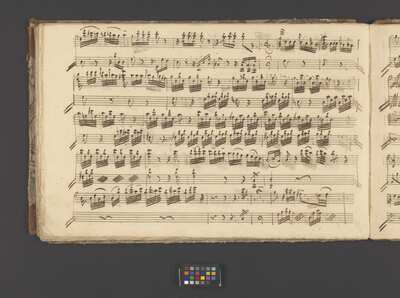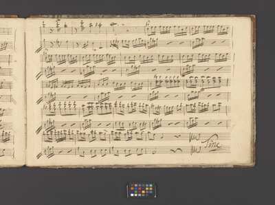 [pl-text: Na okładce prostokątna naklejka z herbem Czartoryskich, otok: „BIBLIOTHECA CZARTORYSCIANA CRACOVIAE”], [pl-text: Na f. 1r. zeszytu nutowego czarna owalna pieczęć tuszowa: otok: „* BIBLIOTEKA * CZARTORYSKICH”, pole: „XX.”]