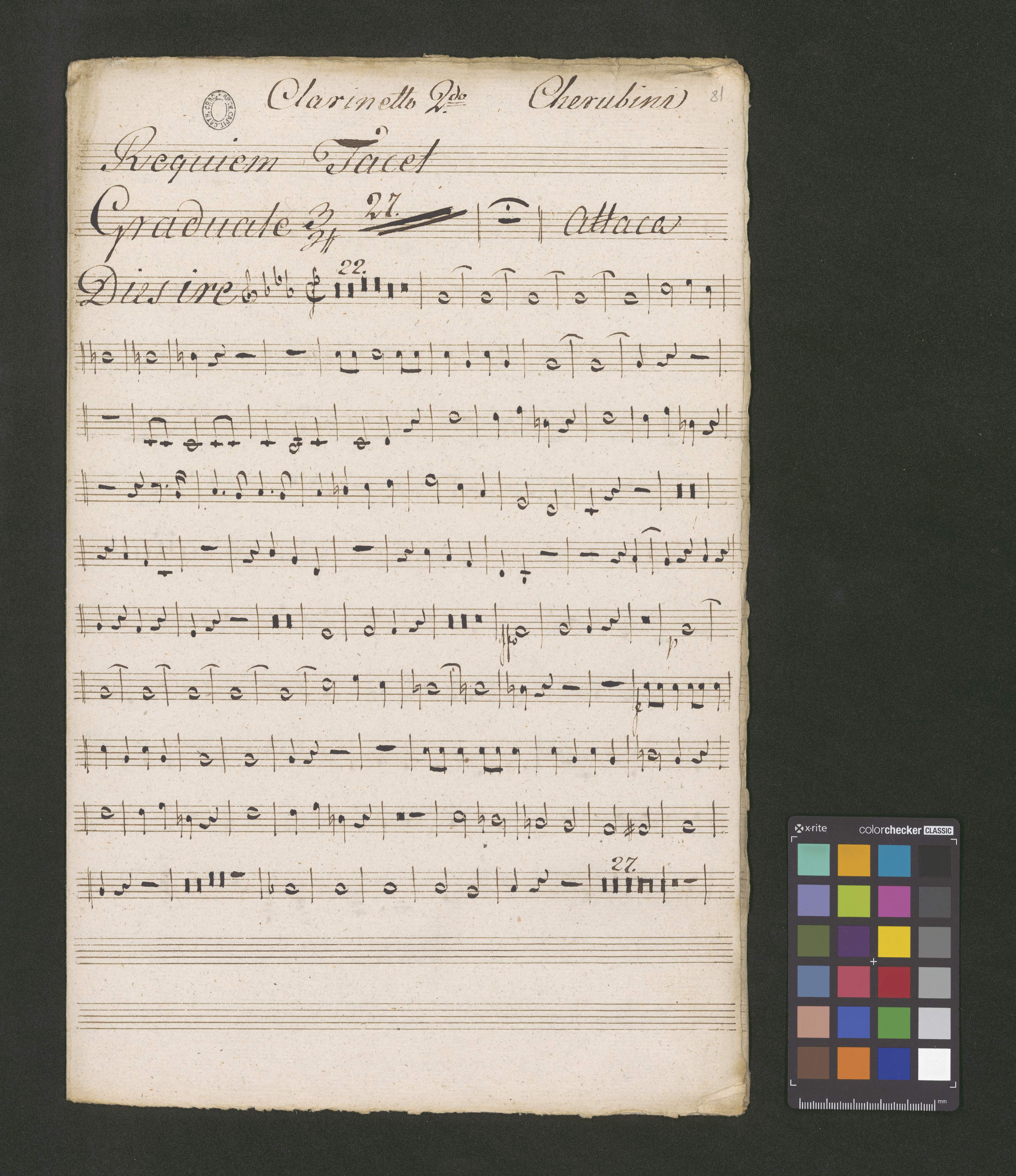 [title page:] Requiem | a quatre voix | et a grand Orchestre | Violino. 1|m|o et 2|d|o | Viola 1|m}a et 2|d|a | Oboe 1|m|a et 2|d|a | Clarinetto 1|m|o et 2|d|o | Fagotto 1|m|o et 2|d|o | Trombone. Alto Tenore et Baſso. | Corno in F. 1|m|o et 2.|d|o | Clarino in C. 1|m|o et 2|d|o | Tympani. | Violoncello 1|m|o et 2|d|o | et Contrabaſso. | Par L: Cherubini