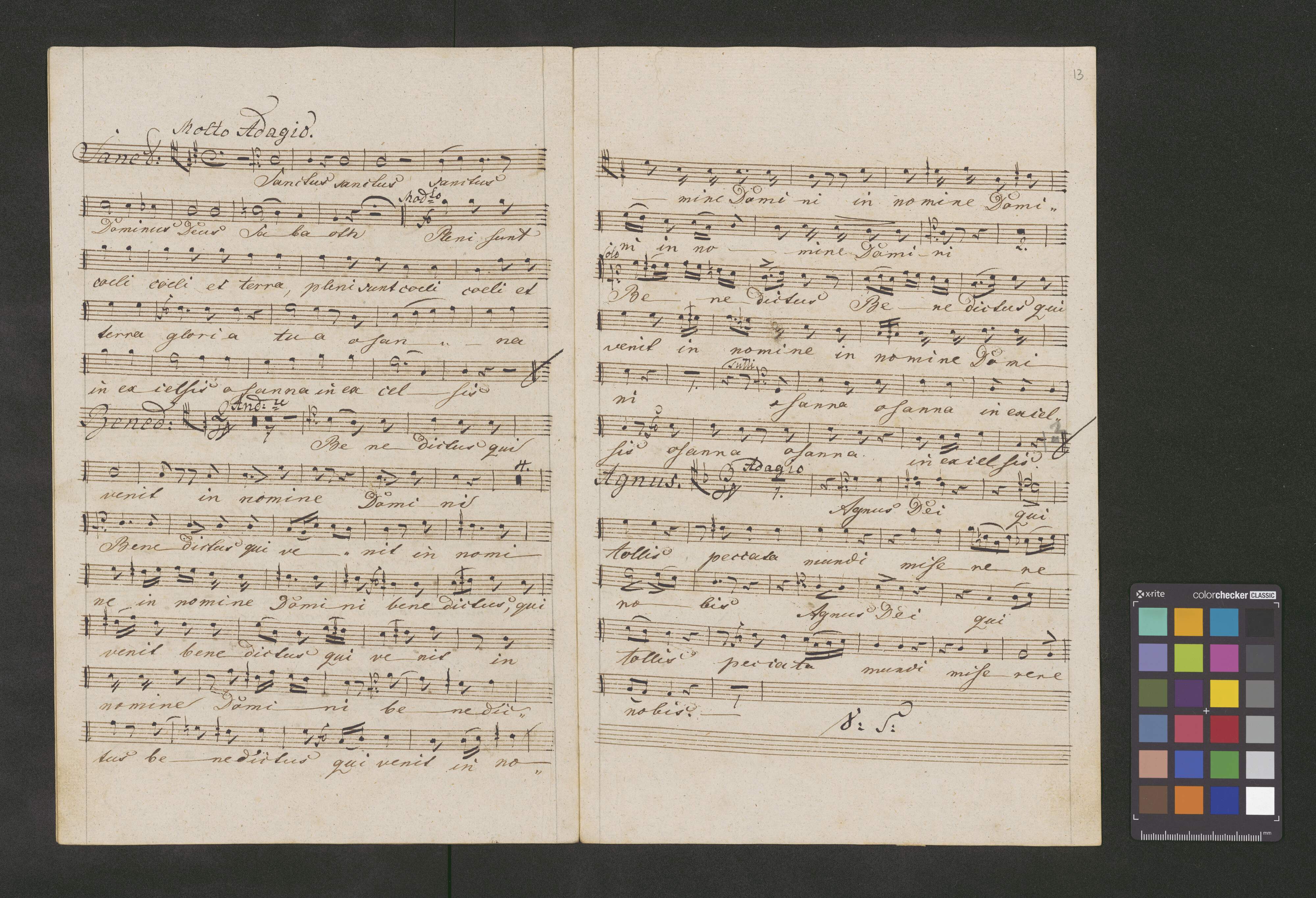 [title page:] N|o I. | Meſse in D. | fuer | Sopran, Alt, Tenor und Baſs. | II. Violinen | Viola | Floete | II. Oboen | II. Horn | II Trompeten | Pauken | und | Orgel | Del Signore H: [sic!] Hahn. | [by other hand:] arkuszy 12