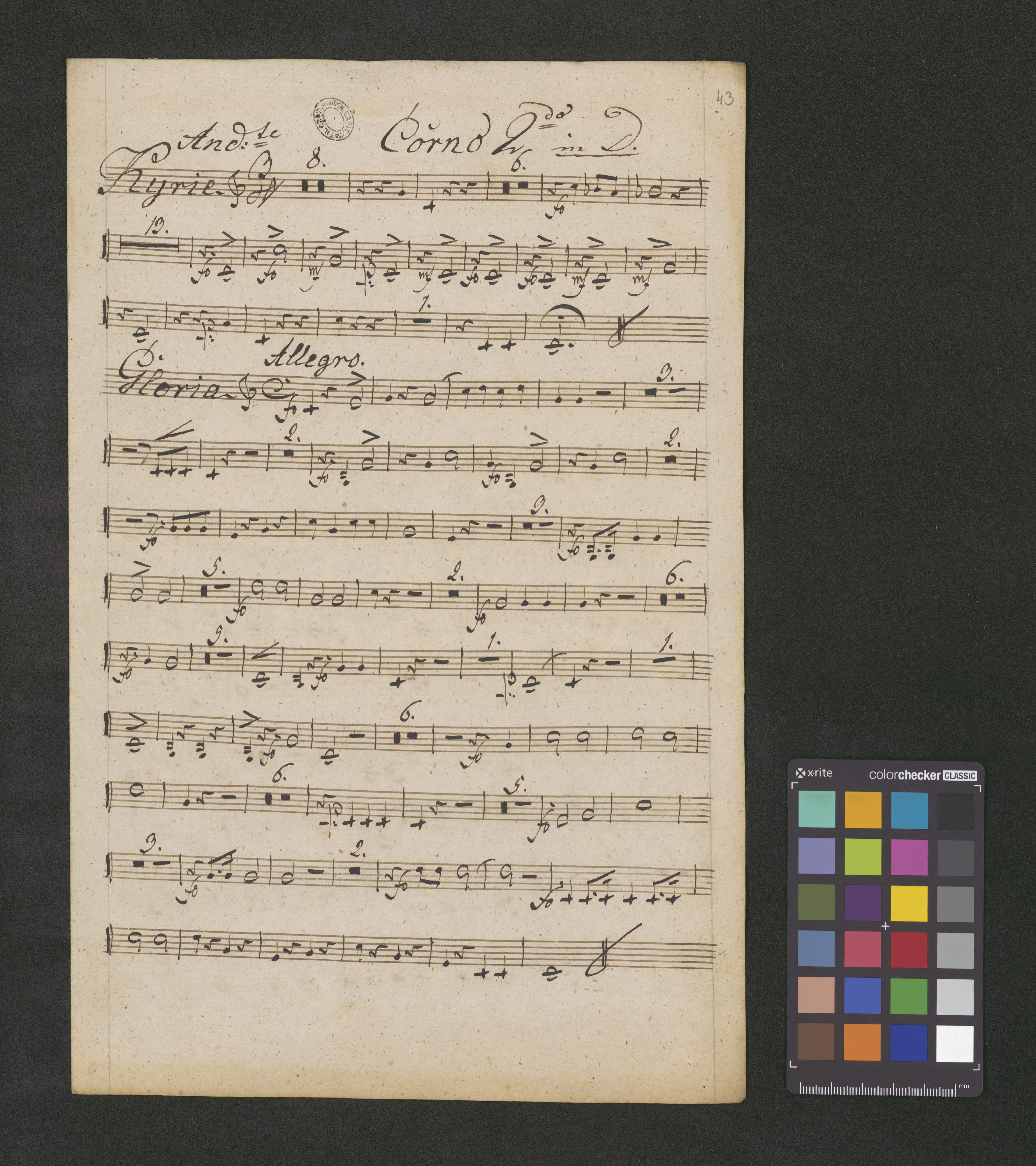 [title page:] N|o I. | Meſse in D. | fuer | Sopran, Alt, Tenor und Baſs. | II. Violinen | Viola | Floete | II. Oboen | II. Horn | II Trompeten | Pauken | und | Orgel | Del Signore H: [sic!] Hahn. | [by other hand:] arkuszy 12