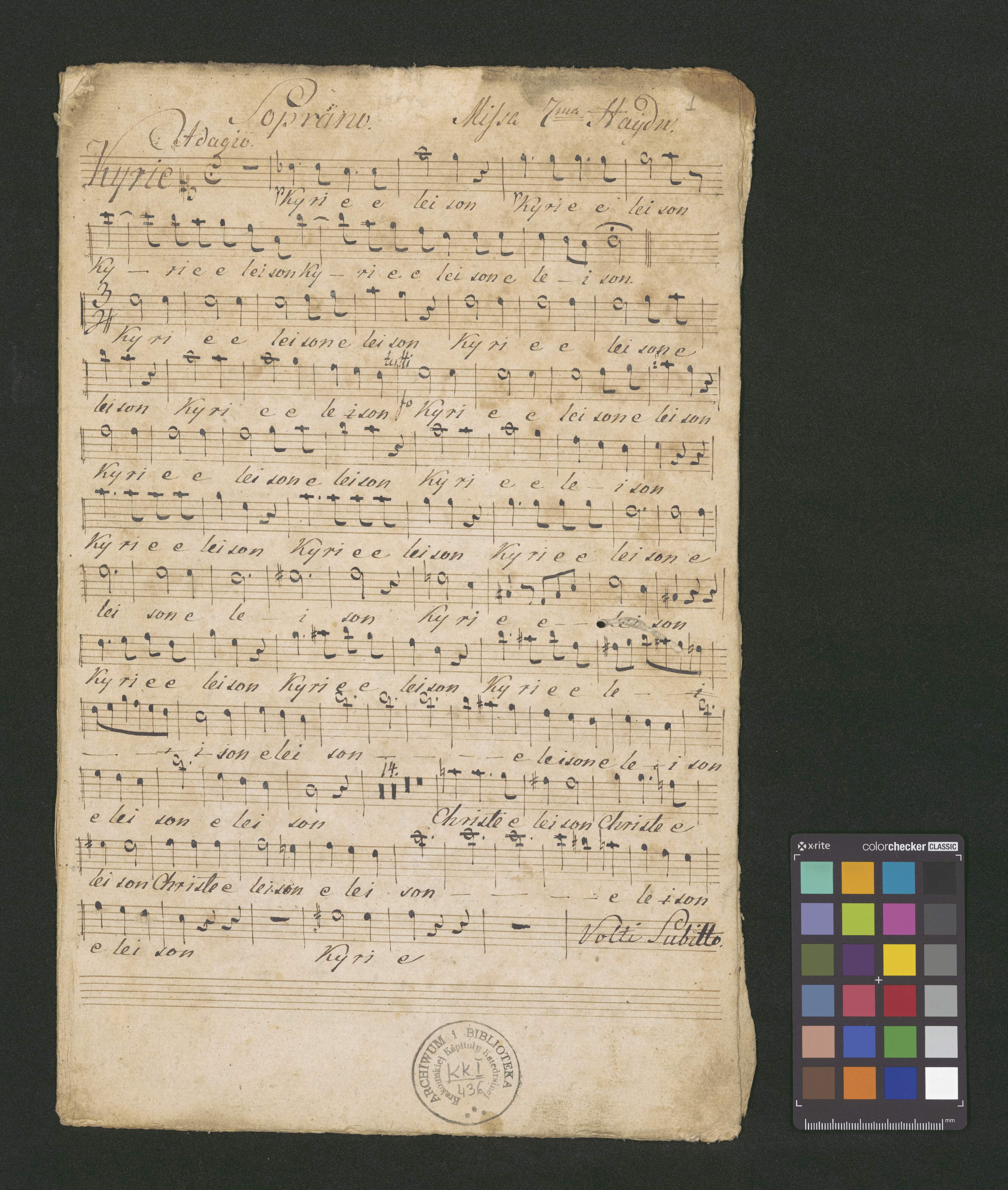 Messa 7|m|a |a 4 voix | avec acompagnement a 2 violons | Viola, Basse, 2 Hautbois, Basson | 2 Trompettes, Timbales et Orgue | composeee | par | Joseph Haydn. zwana Msza [illegible] | No. VII |scripta D. Maji 1826