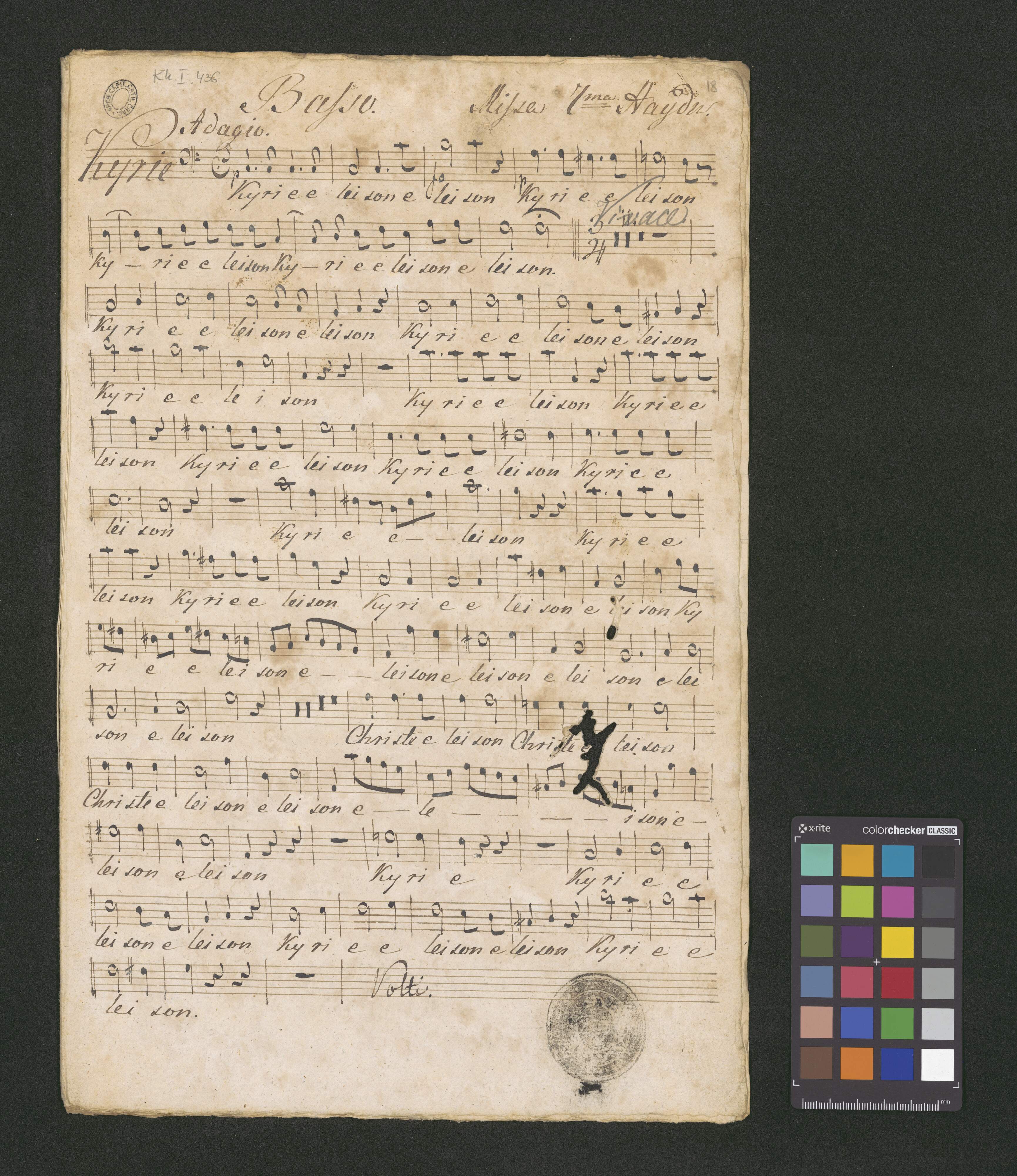 Messa 7|m|a |a 4 voix | avec acompagnement a 2 violons | Viola, Basse, 2 Hautbois, Basson | 2 Trompettes, Timbales et Orgue | composeee | par | Joseph Haydn. zwana Msza [illegible] | No. VII |scripta D. Maji 1826