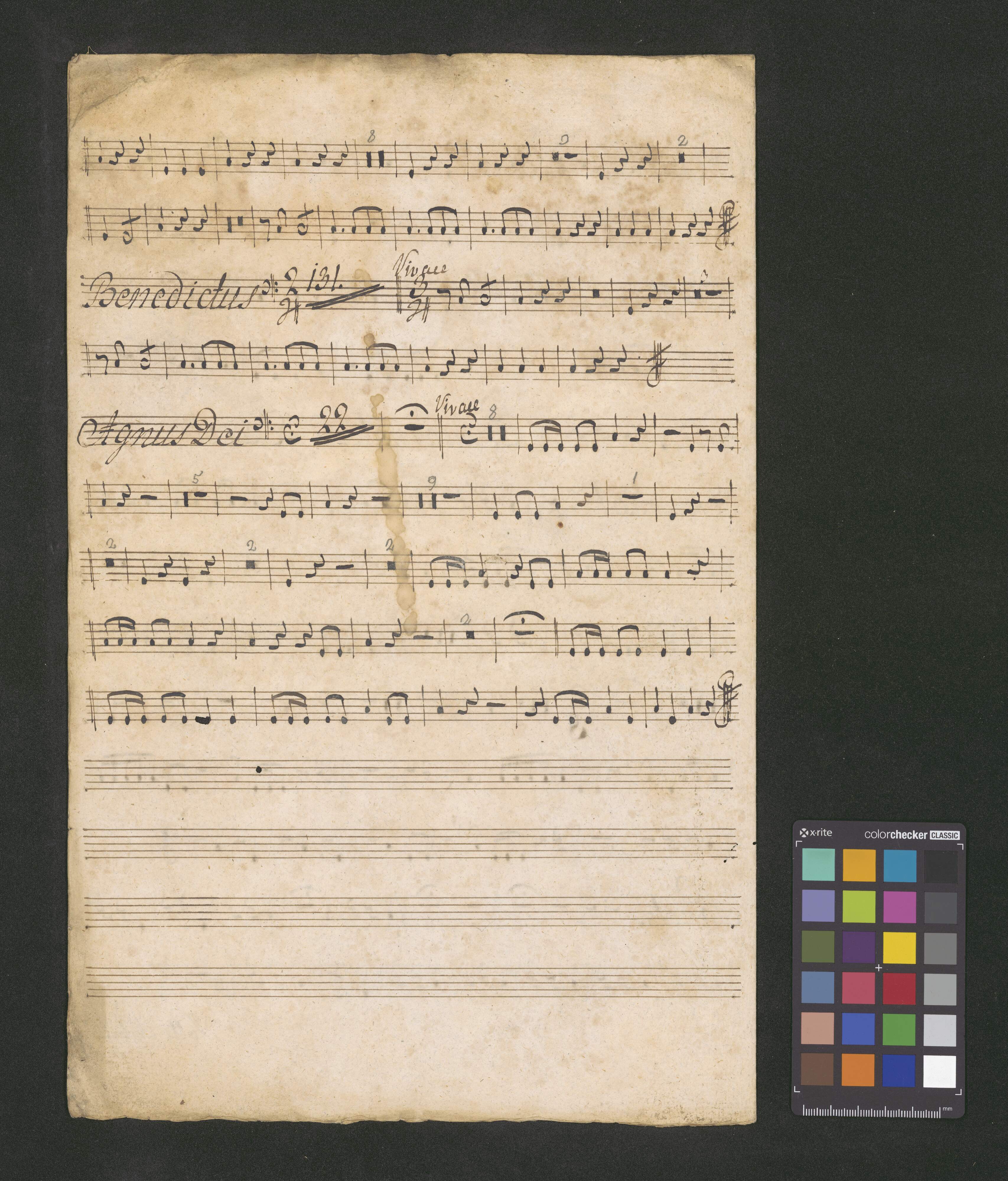 Messa 7|m|a |a 4 voix | avec acompagnement a 2 violons | Viola, Basse, 2 Hautbois, Basson | 2 Trompettes, Timbales et Orgue | composeee | par | Joseph Haydn. zwana Msza [illegible] | No. VII |scripta D. Maji 1826