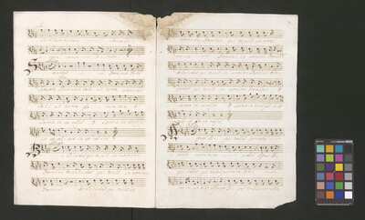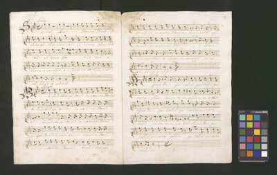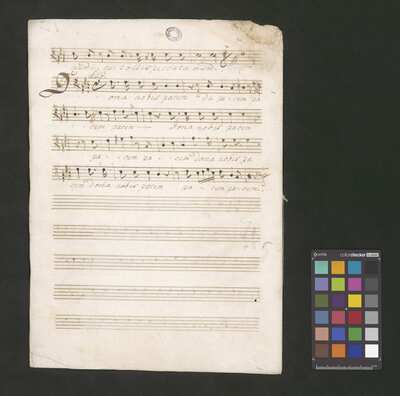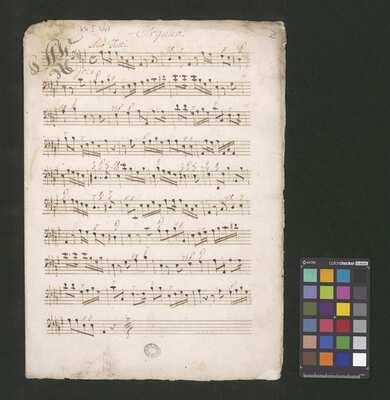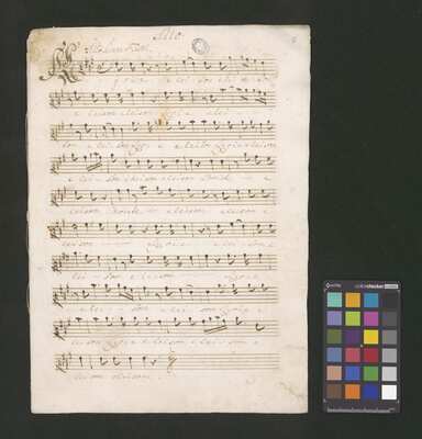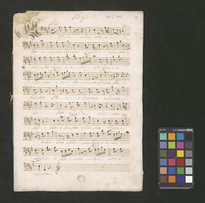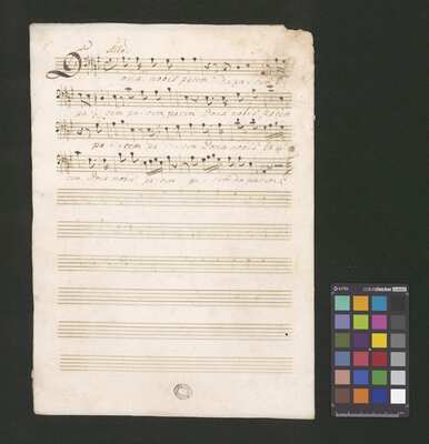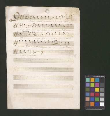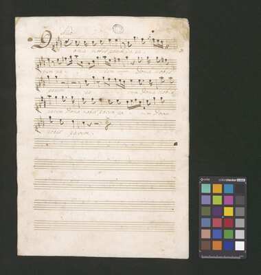 [pl text: każdy wyciąg głosowy i instrumentalny ma numerację stron wykonaną ołówkiem, w górnym prawym narożniku każdej folio recto], [pl text: Jako okładkę wykorzystano współczesna kartka papieru gdzie napisano tytuł utwora z długopisem], [pl text: Pieczęć: „ARCHIWUM I BIBLIOTEKA”, „Krakowskiej Kapituły Katedralnej” Kk.I.441 na pierwsza strona partii Soprano w dolnym prawym rogu]