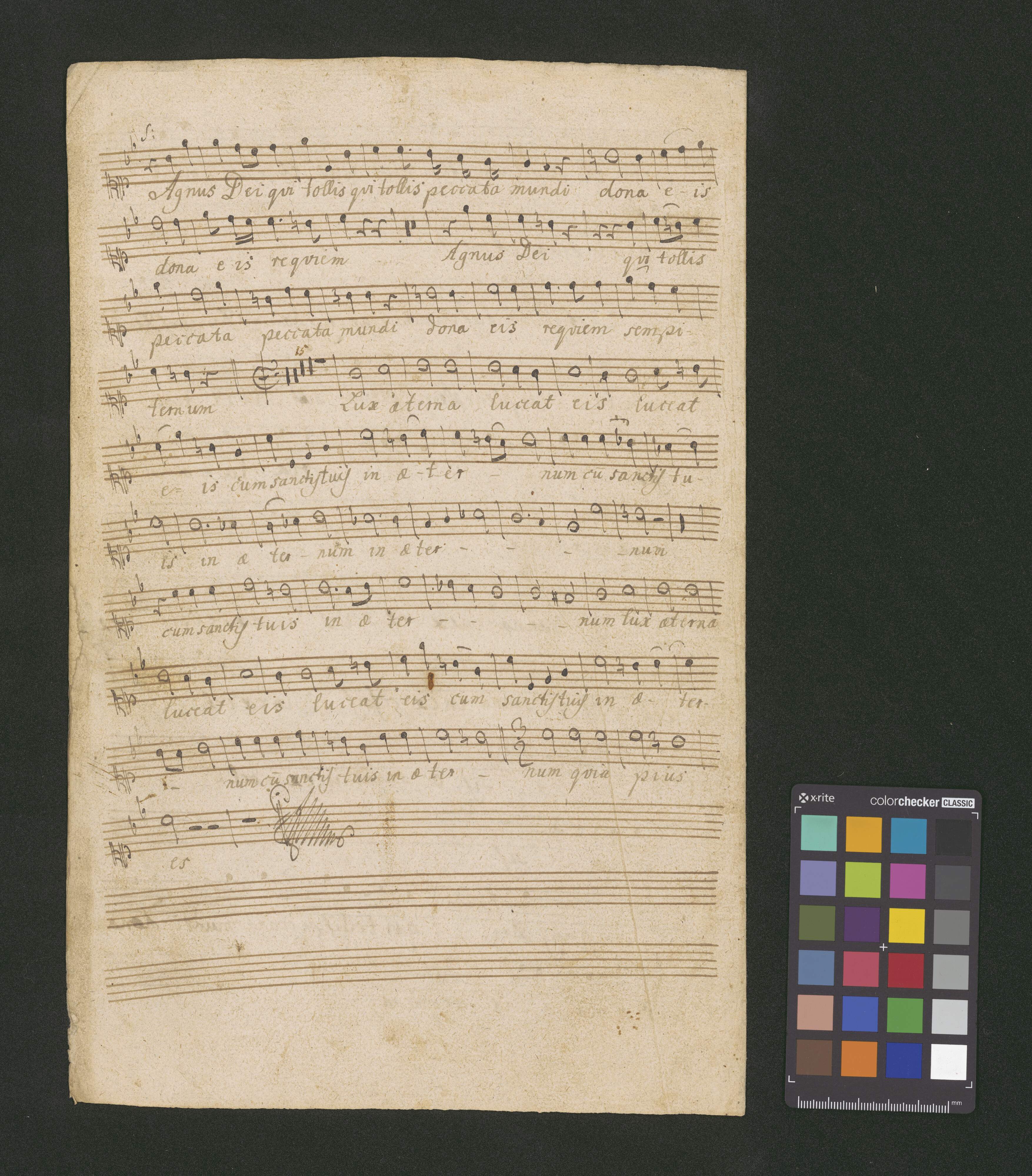 N: 1 m|o Est. Cmolli | Missa Defunctorum | à | Canto, | Alto, | Tenore, | Basso,| Violinis | 2|b|g| | [illegible] | Fundamento | De: Sig. Anto. Laube
