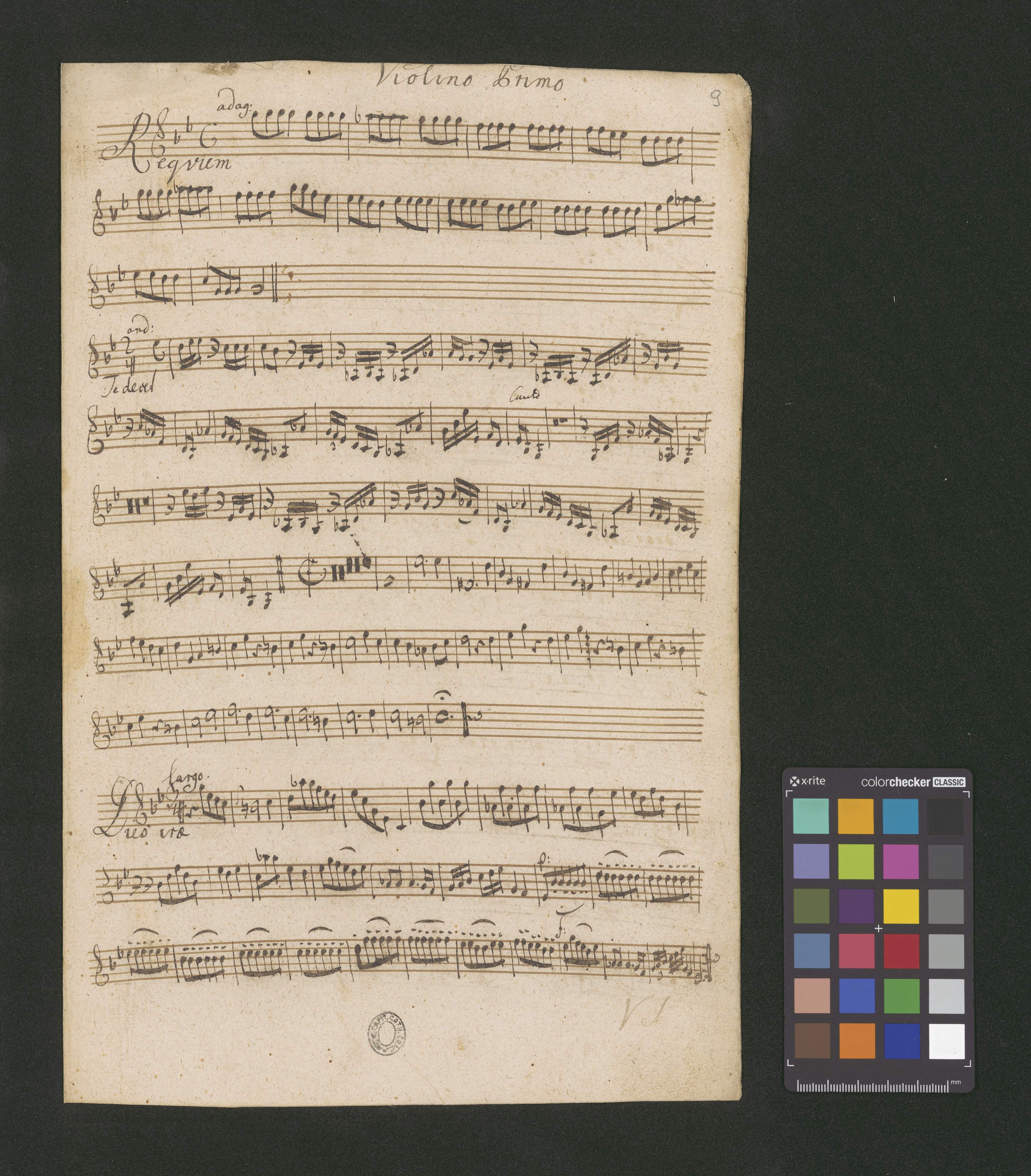 N: 1 m|o Est. Cmolli | Missa Defunctorum | à | Canto, | Alto, | Tenore, | Basso,| Violinis | 2|b|g| | [illegible] | Fundamento | De: Sig. Anto. Laube