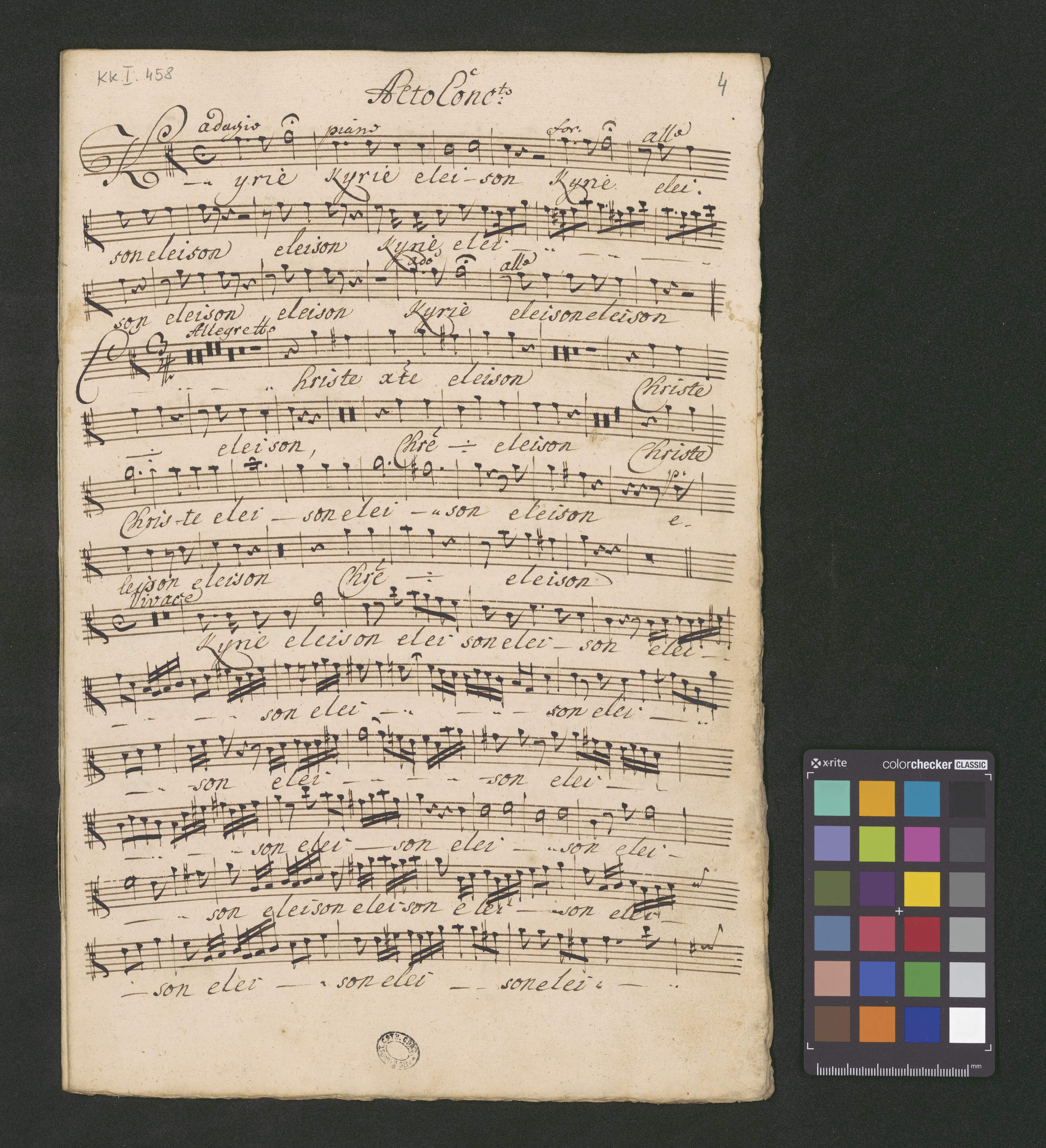 in C | Kyrie et Gloria | a | Canto, Alto, Tenore, Basso. | Violino I.|m|o et II.|d|o I Oboe I.|m|o et II.|d|o | Trombone solo | Clarino I.|m|o et II.|d|o | Tympana | Alto viola, et violone. | con Organo. | Autore Franc. Joan. Navratil