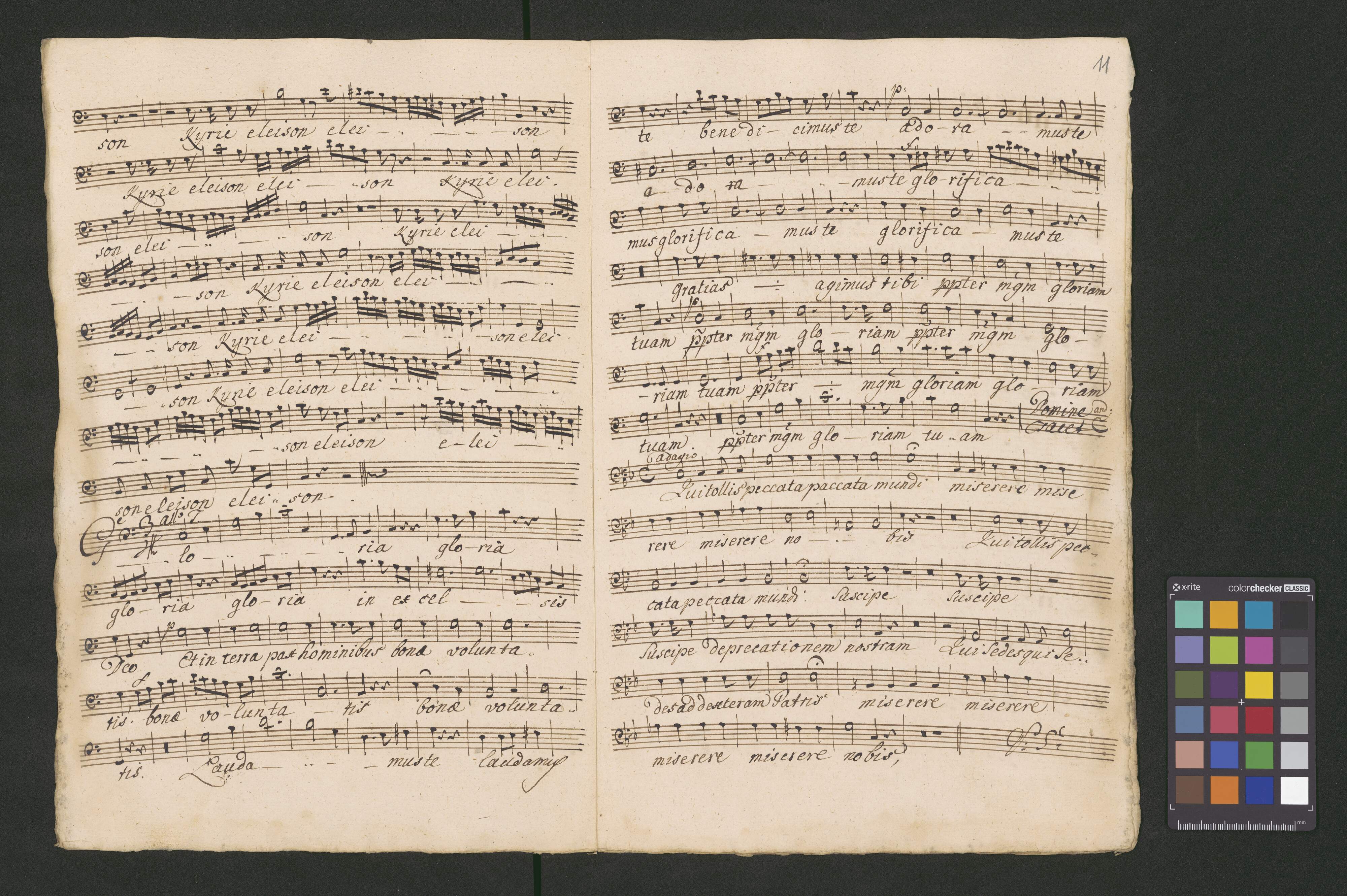in C | Kyrie et Gloria | a | Canto, Alto, Tenore, Basso. | Violino I.|m|o et II.|d|o I Oboe I.|m|o et II.|d|o | Trombone solo | Clarino I.|m|o et II.|d|o | Tympana | Alto viola, et violone. | con Organo. | Autore Franc. Joan. Navratil