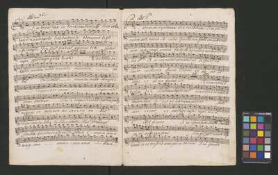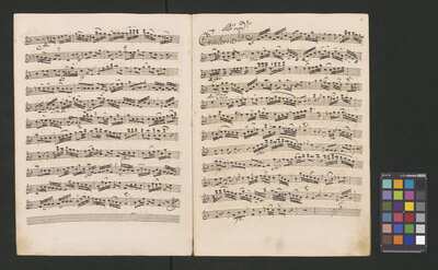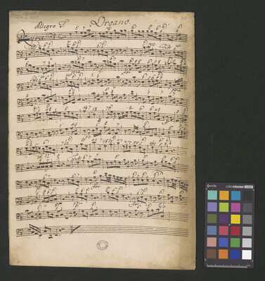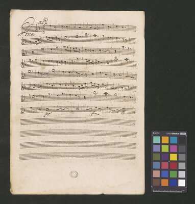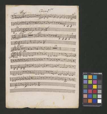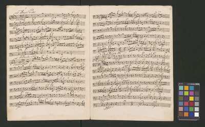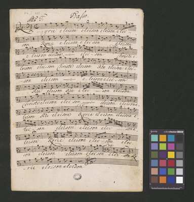 [pl-text: Pieczęć „ARCHIWUM I BIBLIOTEKA”, „Krakowskiej Kapituły Katedralnej” na odwrocie karty tytułowej. Pieczęć „CATH. CRAC. * ARCH. CAPIT.” pojawia się w źródle 20 razy (u dołu stron, na początku i pod koniec każdej partii).], [pl-text: Foliacja w źródle naniesiona ołówkiem, nie wliczając okładki.], [pl-text: Na pierwszej stronie każdej kolejnej partii w lewym górnym rogu naniesiona ołówkiem sygnatura "Kk.I.459".], [pl-text: Przy końcu partii pierwszych skrzypiec inskrypcja "A:M:D:G:".]