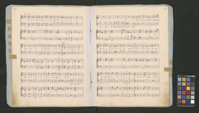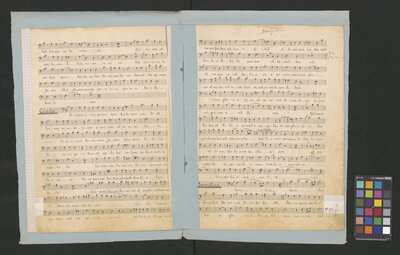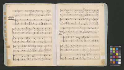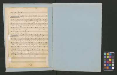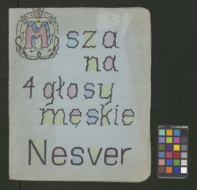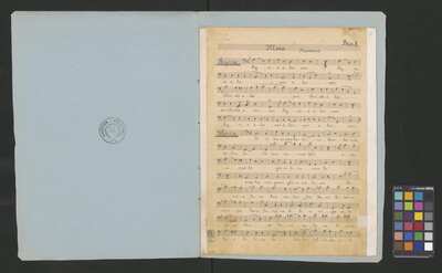 [pl-text: Każdy głos obłożony oddzielną, opisaną i ozdobioną kolorowymi ołówkami okładką. Okładki nieco większe niż karty z zapisanymi partiami. Najprawdopodobniej pochodzą z okresu późniejszego niż źródło.], [pl-text: Pieczęć: „ARCHIWUM I BIBLIOTEKA”, „Krakowskiej Kapituły Katedralnej” pojawia się na odwrocie każdej karty tytułowej. Pieczęć: „CATH. CRAC. * ARCH. CAPIT.” pojawia się 9 razy, w dolnym brzegu kart.], [pl-text: W lewym górnym rogu pierwszych stron wszystkich partii (poza jednym z głosów B 2, spisanych inną ręką) pojawia się prostokątna, czerwona pieczęć: "ZARZĄD * KOŚCIOŁA KATEDRALNEGO * w KRAKOWIE".], [pl-text: Na stronach numer 1, 3, 5, 7, 9 wyciągu głosowego znak drukarski: „J.E.&C|o | „Protokoll. Schutzmarke | N|o 2 | 12 linig.” widoczny częściowo lub w całości. w lewym dolnym rogu strony.], [pl-text: Foliacja w źródle naniesiona ołówkiem. Strony w wyciągu głosów ponumerowane atramentem przez kopistę.], [pl-text: Jedna z partii B 2 spisana inną ręką. Na końcu zapisu inskrypcja: "Jan Janczewski | 6.III.62".], [pl-text: We wszystkich partiach pojawiają się poprawki tekstu oraz zapisu nutowego sporządzone ołówkiem lub długopisem. Karty noszą znamiona napraw i podklejania nowszym papierem.], [pl-text: Na karcie tytułowej jednej z partii T 2 naklejona karteczka z sygnaturą: "Kk.I.462".]