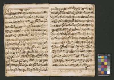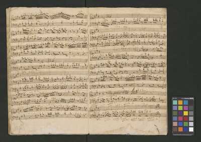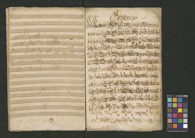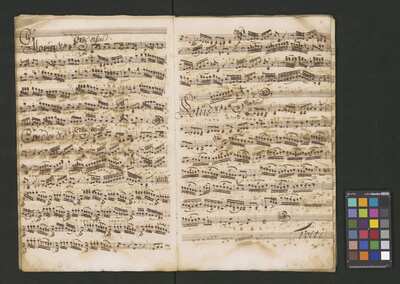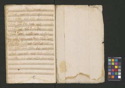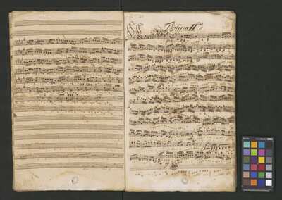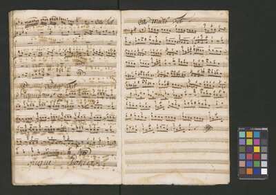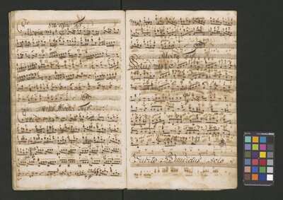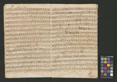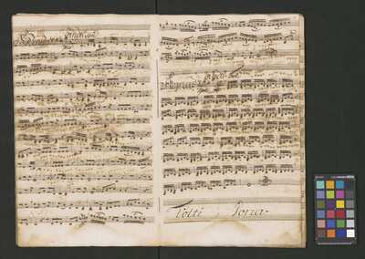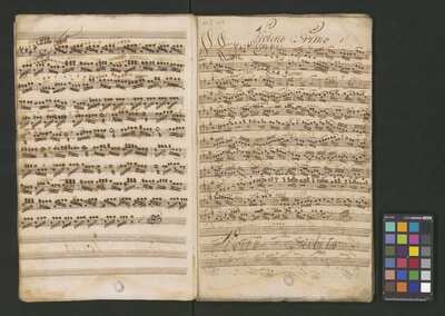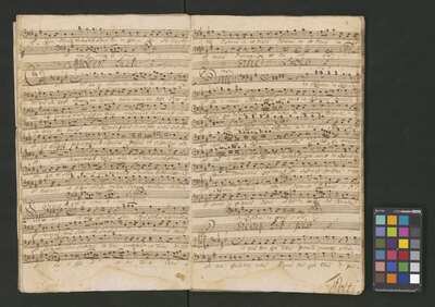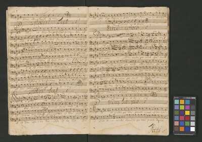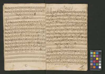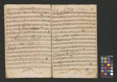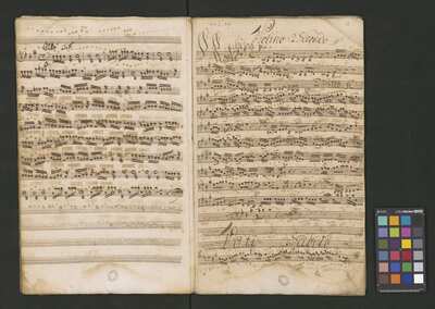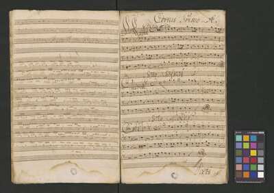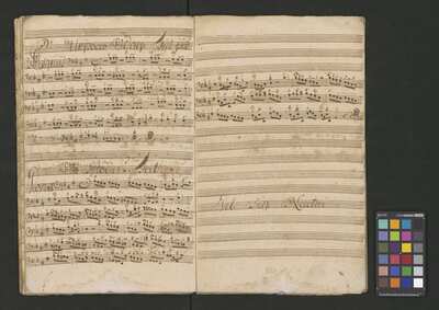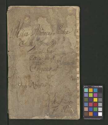 [pl-text: Pieczęć: „ARCHIWUM I BIBLIOTEKA”, „Krakowskiej Kapituły Katedralnej” na odwrocie karty tytułowej. Pieczęć: „CATH. CRAC. * ARCH. CAPIT.” pojawia się 22 razy w dolnym brzegu kart.], [pl-text: Foliacja w źródle naniesiona ołówkiem.], [pl-text: Na karcie tytułowej poniżej nazwiska autora naniesiony czerwonym ołówkiem napis: "N 9".], [pl-text: Podwójnie rozpisane partie vl 1, 2 oraz org.], [pl-text: W lewym górnym rogu partii głosowych naniesiona ołówkiem sygnatura: "Kk.I.465".], [pl-text: Okładka źródła mocno podniszczona. Niektóre karty czymś zalane u dołu. Część kart mało czytelna ze względu na dużo przebijającego atramentu lub zamazań.]