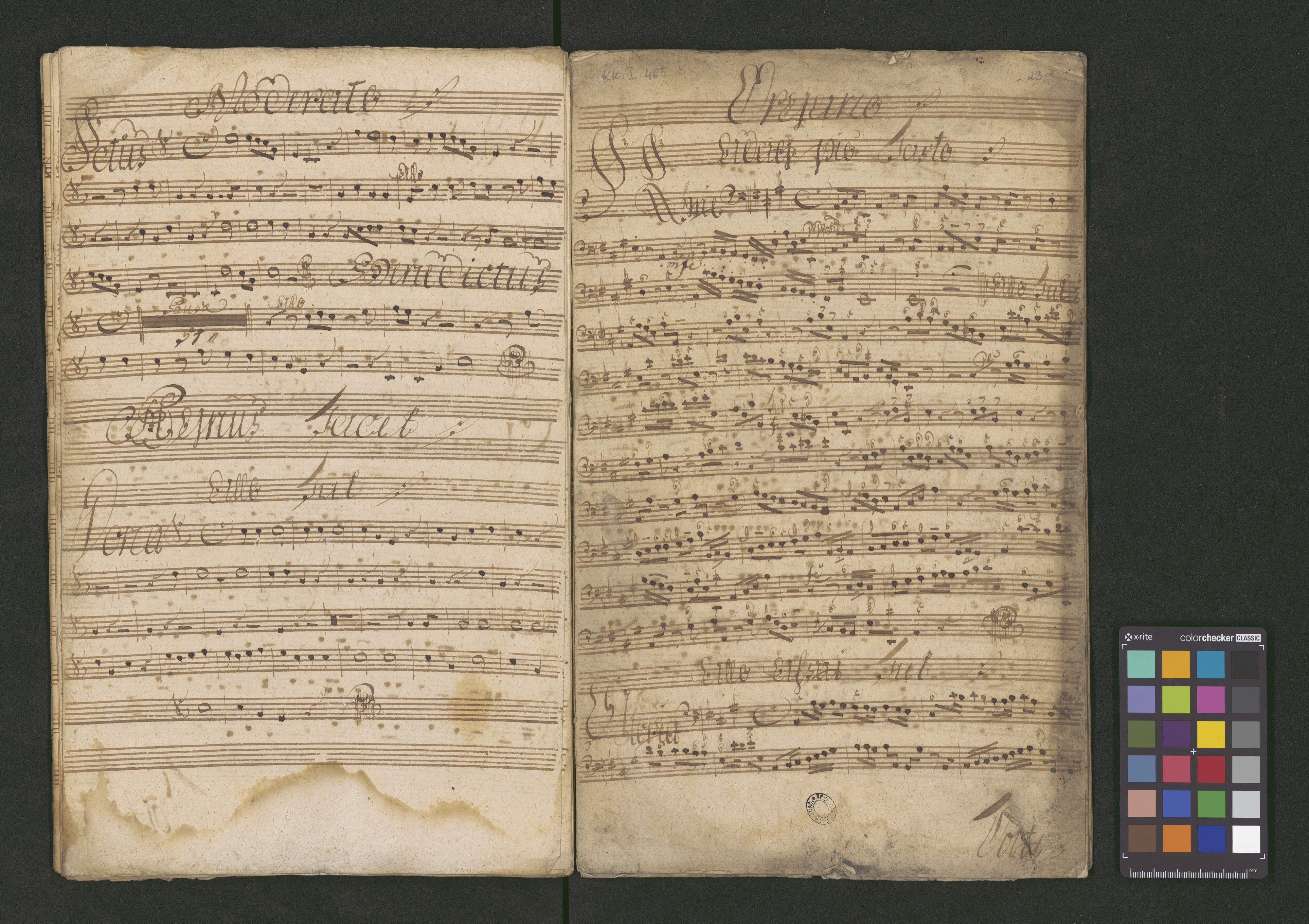 Missa Midiocris Pulchra | C: A: T: B: | Violini due | Corni due A. | con | Organo solo. | Sig: Novotni | De Musica | [unreadable initials] Qang
