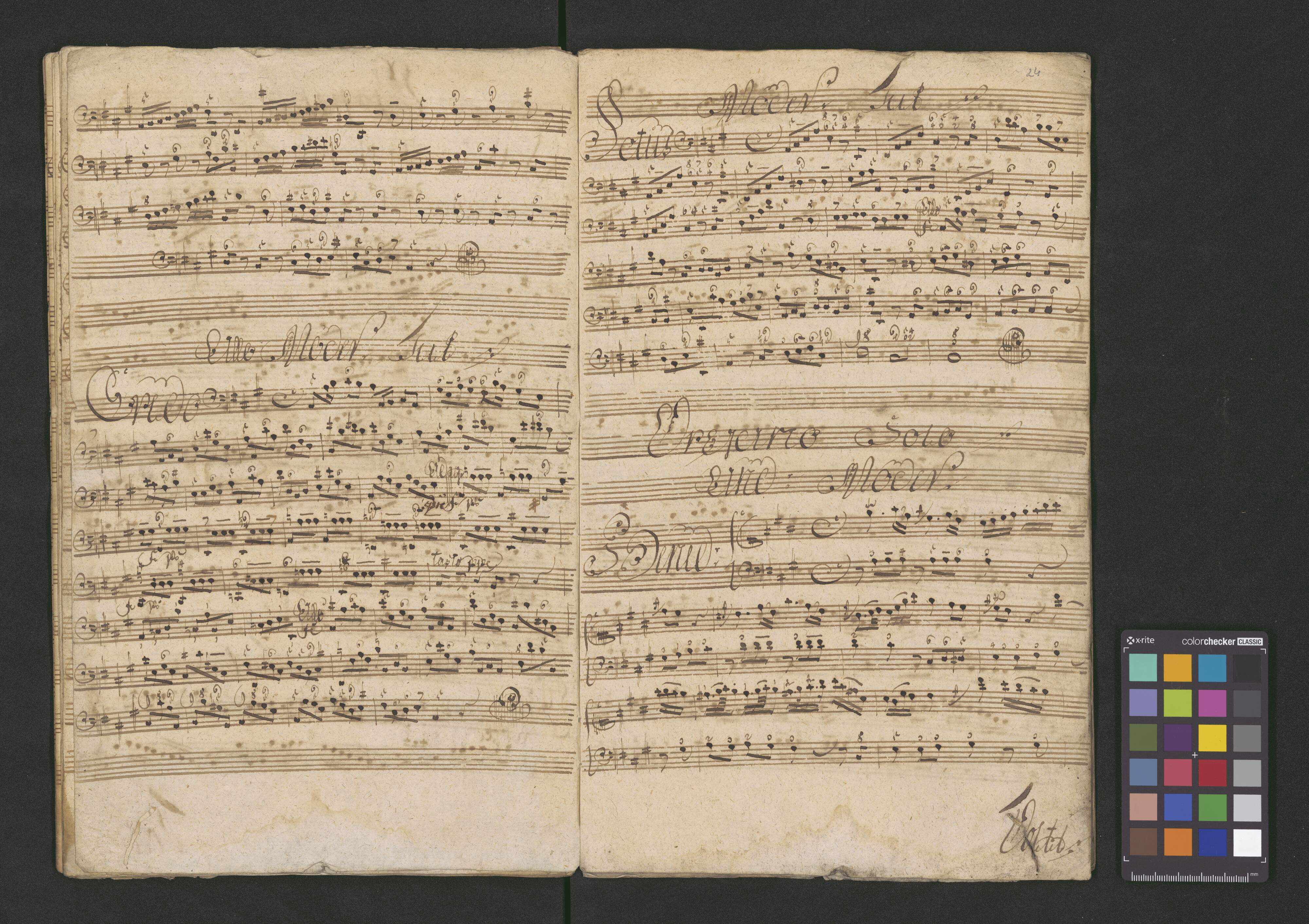 Missa Midiocris Pulchra | C: A: T: B: | Violini due | Corni due A. | con | Organo solo. | Sig: Novotni | De Musica | [unreadable initials] Qang