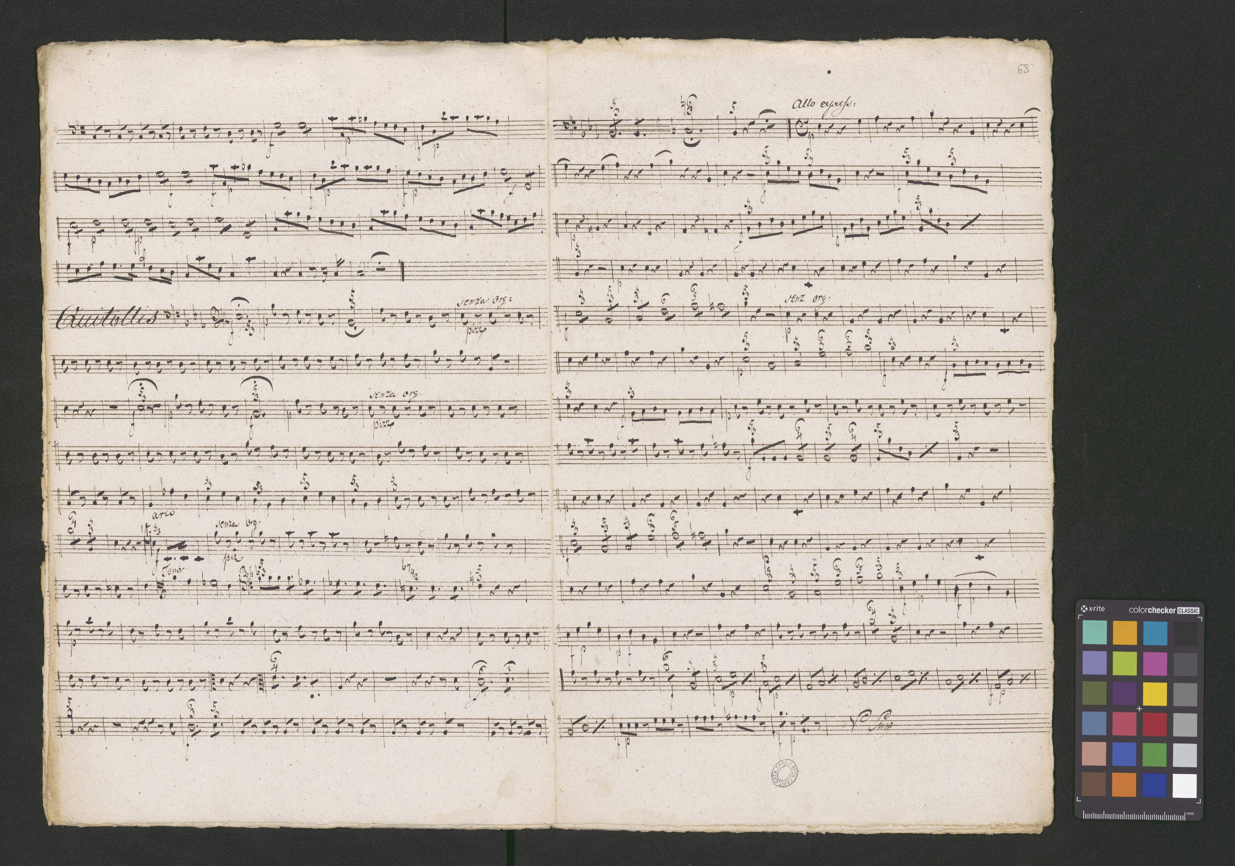 N 24 I Missa | Kyrie et Gloria | Del Segnore Ferdinando Orlandi | Soprano. Alto | Tenore e Basso | Violino I|m|i et secondo I Alto Viola I Oboa Sola | Corni due I Trombe | et Organo. | Pro usu cele[!]ie Cath. Cra