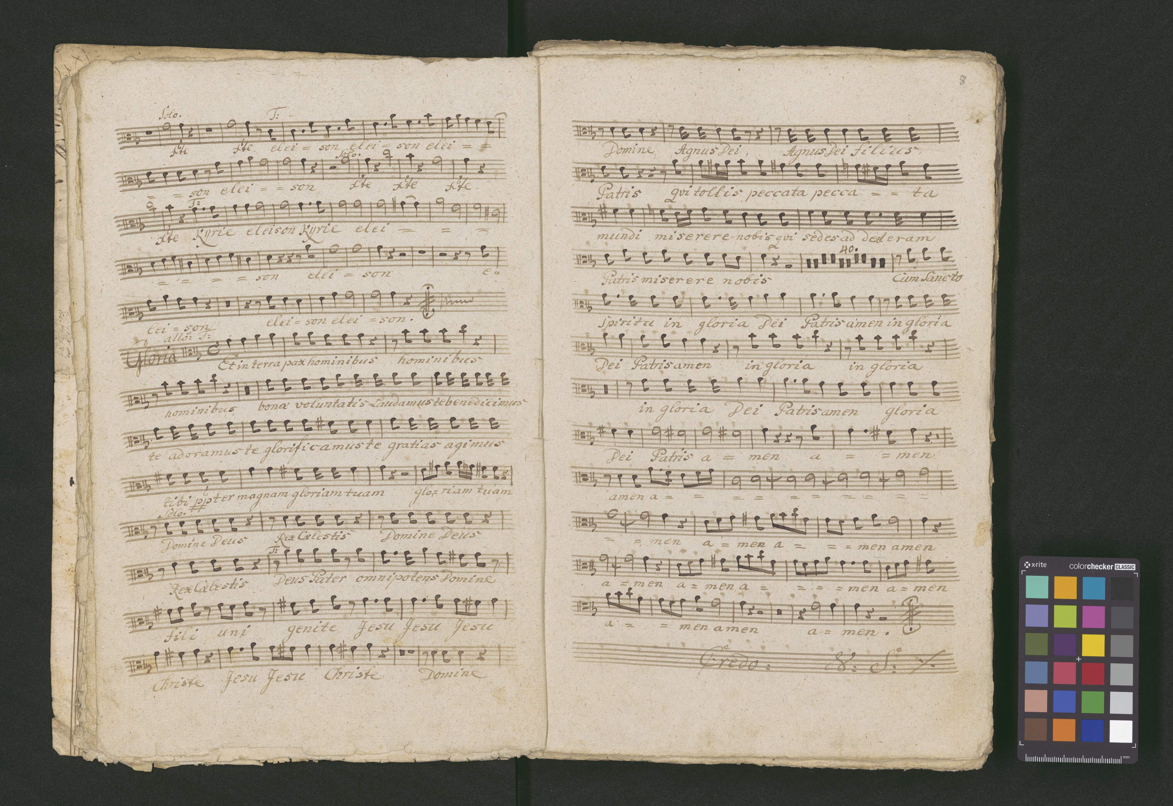 MISSA Toni C. | a | Canto Alto | Tenore Basso | Violinis 2|bus| | Obois 2|bus| | {obligatis | Vornuis 2|bus| | Clarinis 2|bus| | {ad Libitum | Tympana | Viola di Alto obligata | con | Organo et Violone. | Composita par Wencejlaum | Raschek Ao 1789|no| Mense Aprili