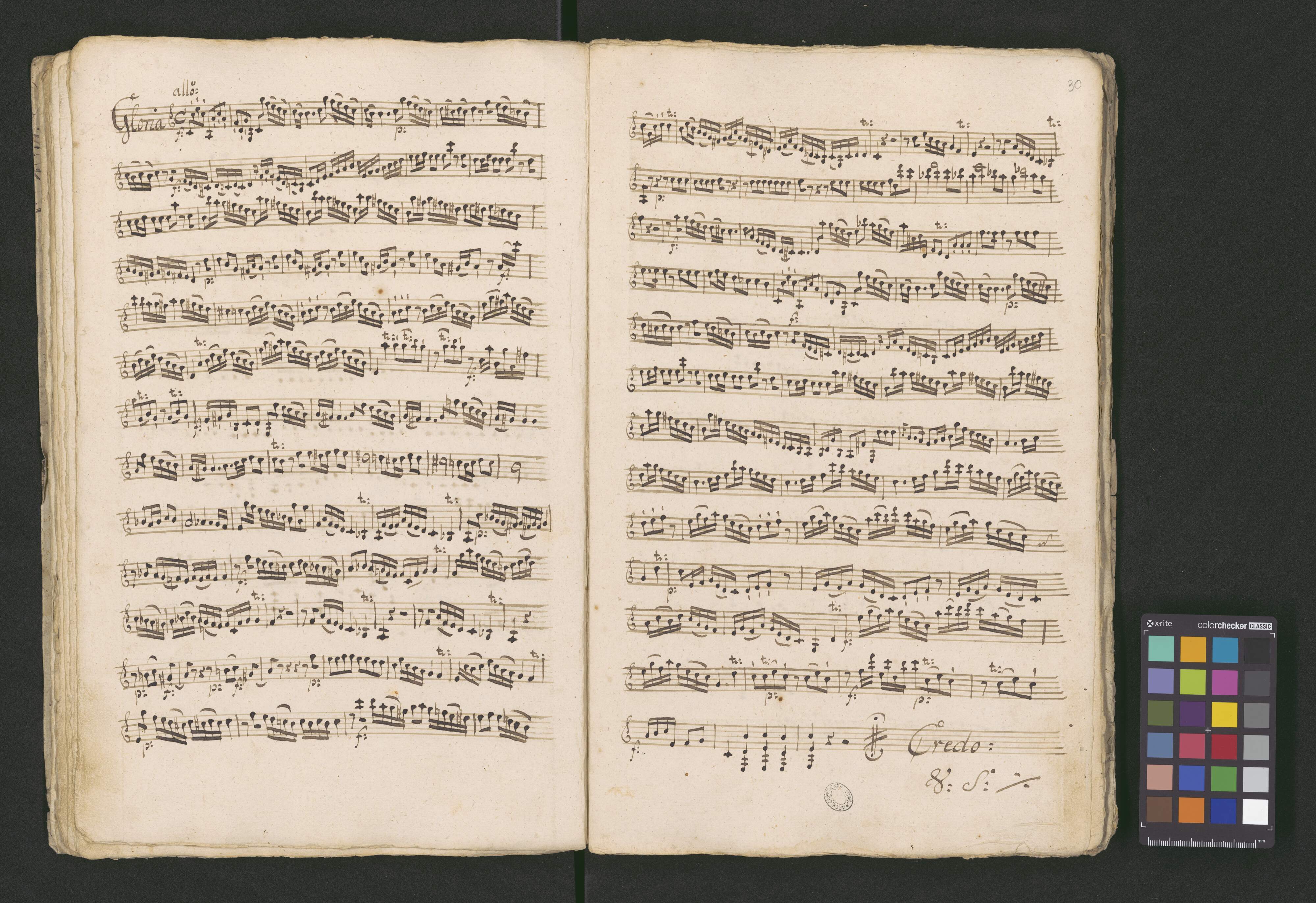 MISSA Toni C. | a | Canto Alto | Tenore Basso | Violinis 2|bus| | Obois 2|bus| | {obligatis | Vornuis 2|bus| | Clarinis 2|bus| | {ad Libitum | Tympana | Viola di Alto obligata | con | Organo et Violone. | Composita par Wencejlaum | Raschek Ao 1789|no| Mense Aprili