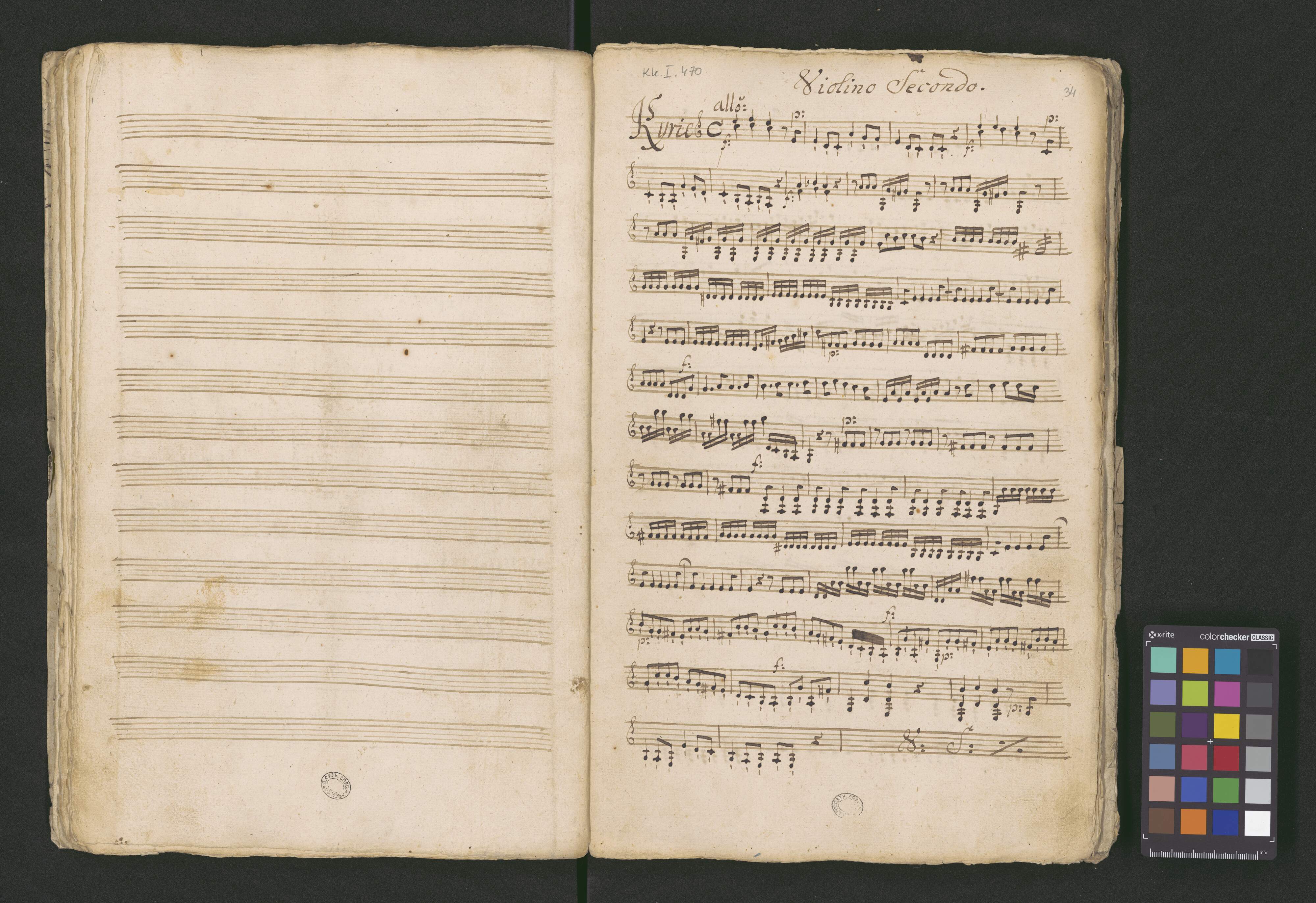 MISSA Toni C. | a | Canto Alto | Tenore Basso | Violinis 2|bus| | Obois 2|bus| | {obligatis | Vornuis 2|bus| | Clarinis 2|bus| | {ad Libitum | Tympana | Viola di Alto obligata | con | Organo et Violone. | Composita par Wencejlaum | Raschek Ao 1789|no| Mense Aprili
