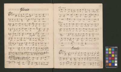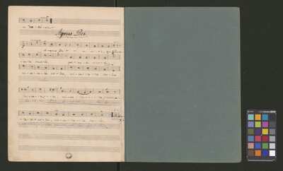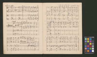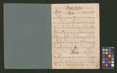 [pl-text: Każda partia obłożona oddzielną okładką.], [pl-text: Pieczęć: „ARCHIWUM I BIBLIOTEKA”, „Krakowskiej Kapituły Katedralnej” na odwrocie każdej karty tytułowej. Pieczęć: „CATH. CRAC. * ARCH. CAPIT.” pojawia się 10 razy (dolny brzeg kart).], [pl-text: Zdwojone partie głosów wokalnych oraz obie partytury głosowe spisane inną ręką.], [pl-text: Na zestawie głosów wokalnych (T 1,2, B 1, 2) pieczęć: "DYREKCYA C.K. GIMNAZYUM Św. ANNY * W KRAKOWIE*". Umiejscowiona na kartach tytułowych (okładkach) oraz na pierwszych stronach głosów. Egzemplarze opatrzone tą pieczęcią pod koniec zapisu nutowego podpisane: "Sobieniowski Stanisław. | V A. gim. św. Anny" (partia T 1) lub w różnych wariantach skrótowych (pozostałe głosy).], [pl-text: Karty tytułowe pochodzące z gimnazjum św. Anny podpisane ołówkiem na naklejonym na okładkę kawałku papieru. Pozostałe partie podpisane bezpośrednio na okładce niebieskim ołówkiem.], [pl-text: Foliacja w źródle naniesiona ołówkiem.], [pl-text: W partiach nanoszone poprawki tekstu słownego lub muzycznego sporządzone ołówkiem lub niebieskim długopisem.]