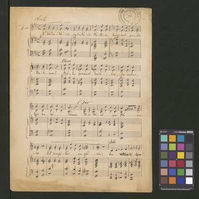 [pl-text: Zapis partyturowy dwóch głosów wokalnych z adnotacjami "Solo", "Choro" i "Duo" z akompaniamentem.], [pl-text: Foliacja ołówkiem w prawym górnym rogu kart.], [pl-text: Na karcie 1r pieczęć: „ARCHIWUM I BIBLIOTEKA”, „Krakowskiej Kapituły Katedralnej” z sygnaturą.], [pl-text: Na karcie 2v pieczęć: "CATH. CRAC. * ARCH. CAPIT."], [pl-text: Na kartach 2r i 2v puste pięciolinie.]