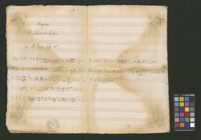 [pl-text: Foliacja ołówkiem w prawym górnym rogu kart.], [pl-text: Karty 1-2 stanowią okładkę: na 1r strona tytułowa, na 1v-2r zapisana partia Organo. Partia Basso Solo zapisana na luźnej karcie 3.], [pl-text: Na kartach 2v i 3v puste pięciolinie.], [pl-text: Na karcie 1v pieczęć: „ARCHIWUM I BIBLIOTEKA”, „Krakowskiej Kapituły Katedralnej” z sygnaturą.], [pl-text: Na kartach 2r, 3r pieczęć: "CATH. CRAC. * ARCH. CAPIT."]