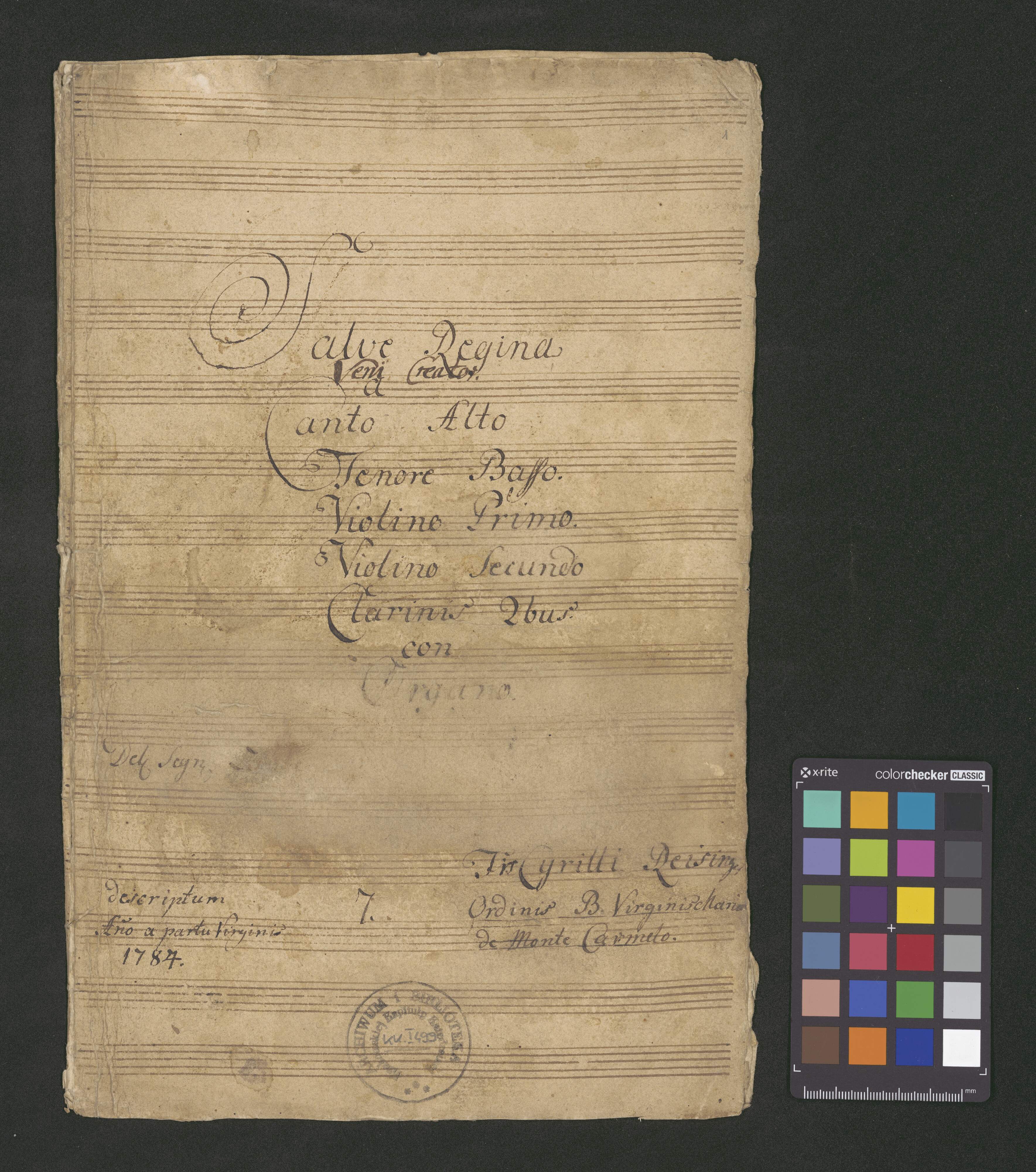 [title page:] Salve Regina | [added later:] Veni Creator | [continuation of the original title:] a | Canto Alto | Tenore Basso. | Violino Primo. | Violino Secundo | Clarinis 2bus. | con | Organo. | Del Segn [faded letters] | [on the left:] descriptorum | Anno a partu Virginis | 1784. [in the middle:] 7. [on the right:] Fs Cyrilli Reising[er] | Ordinis B. Virginischari[a] | de Monte Carmelo