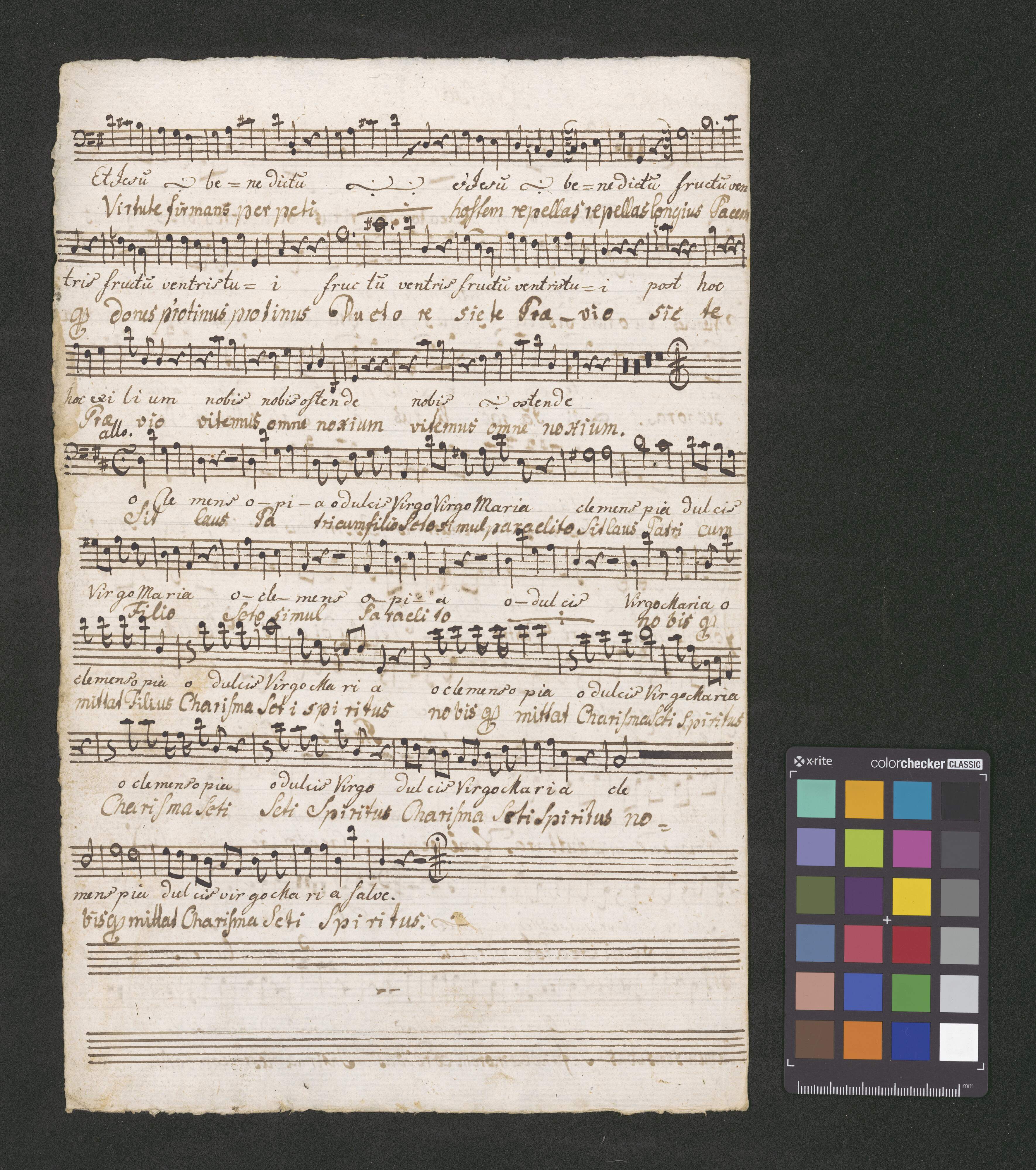[title page:] Salve Regina | [added later:] Veni Creator | [continuation of the original title:] a | Canto Alto | Tenore Basso. | Violino Primo. | Violino Secundo | Clarinis 2bus. | con | Organo. | Del Segn [faded letters] | [on the left:] descriptorum | Anno a partu Virginis | 1784. [in the middle:] 7. [on the right:] Fs Cyrilli Reising[er] | Ordinis B. Virginischari[a] | de Monte Carmelo