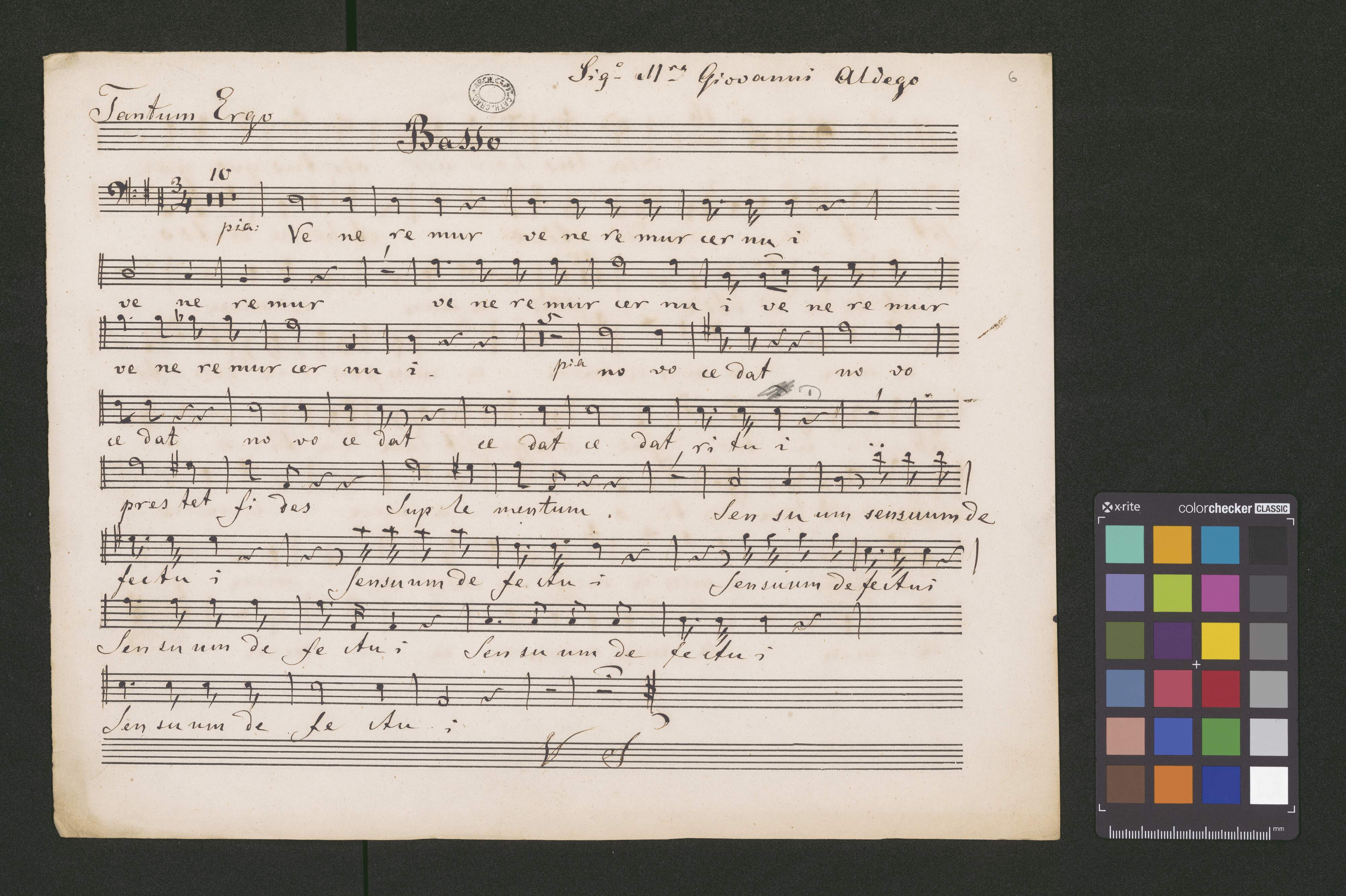 [on S card:] Tantum Ergo del Sig.|e| M:|ro| Giovani Aldego