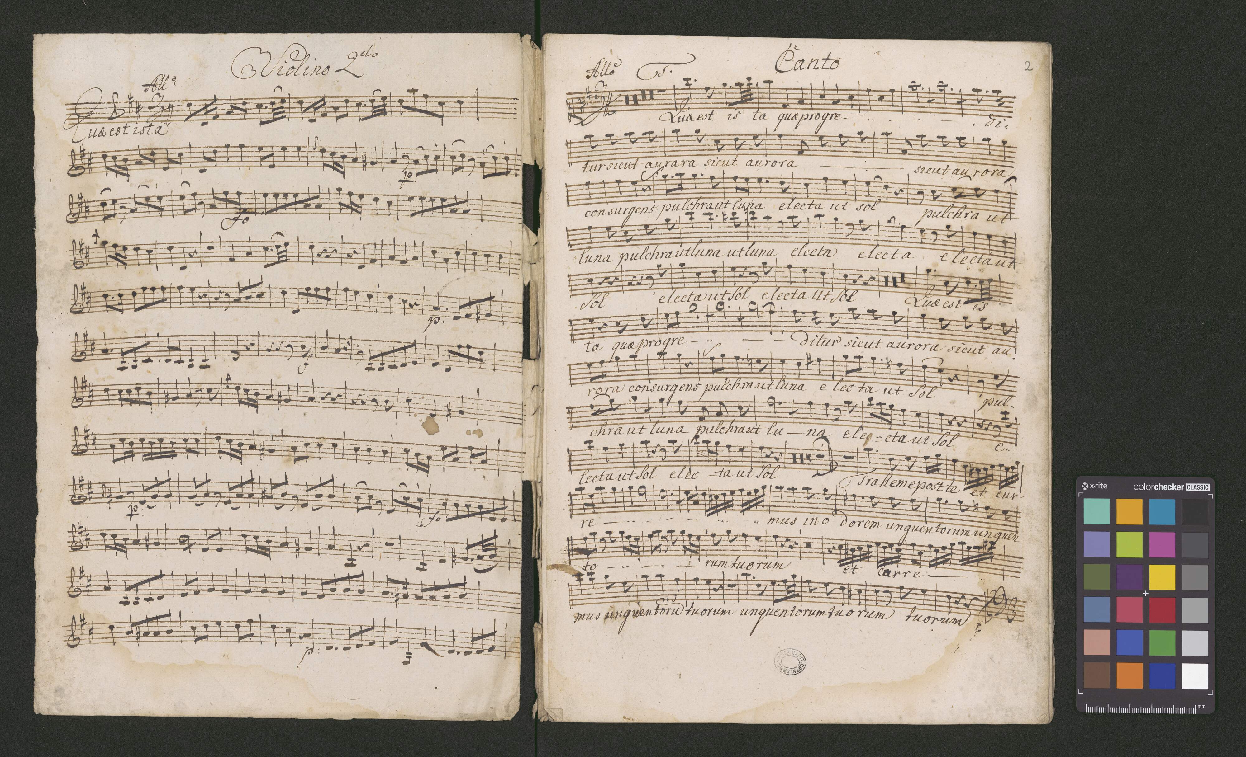 N: 14 | Mottetto in D. | De Beata Virgina Maria | Textu | Qua est ista, qua progredidur sicut aurora | a | 4.|or| Vocibus | 2. Violonis | cum | ORGANO. | Authore Domino Francisco Brixi | Navratil
