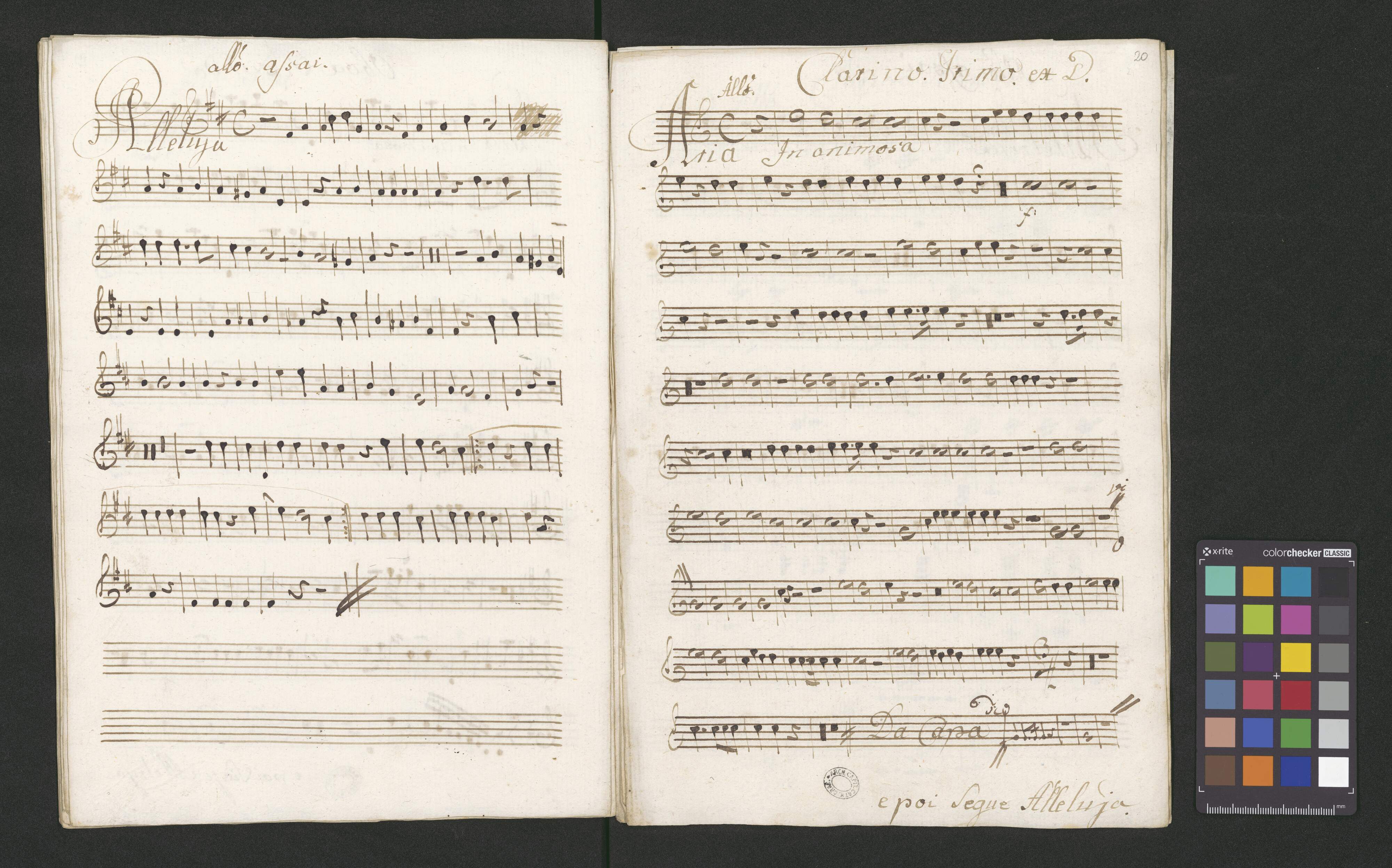 Motetto. | a. | Basso. Solo. | Canto. Alto. Tenore in pieno. | Violino. Primo. | Violino. Secundo. | Oboe Primo. | Oboe. Secondo | 2 Clarino | Viola et Tympano | Con | Organo et Violono. | Auth: gasman. | Ao. 1796 [further unreadable] TR