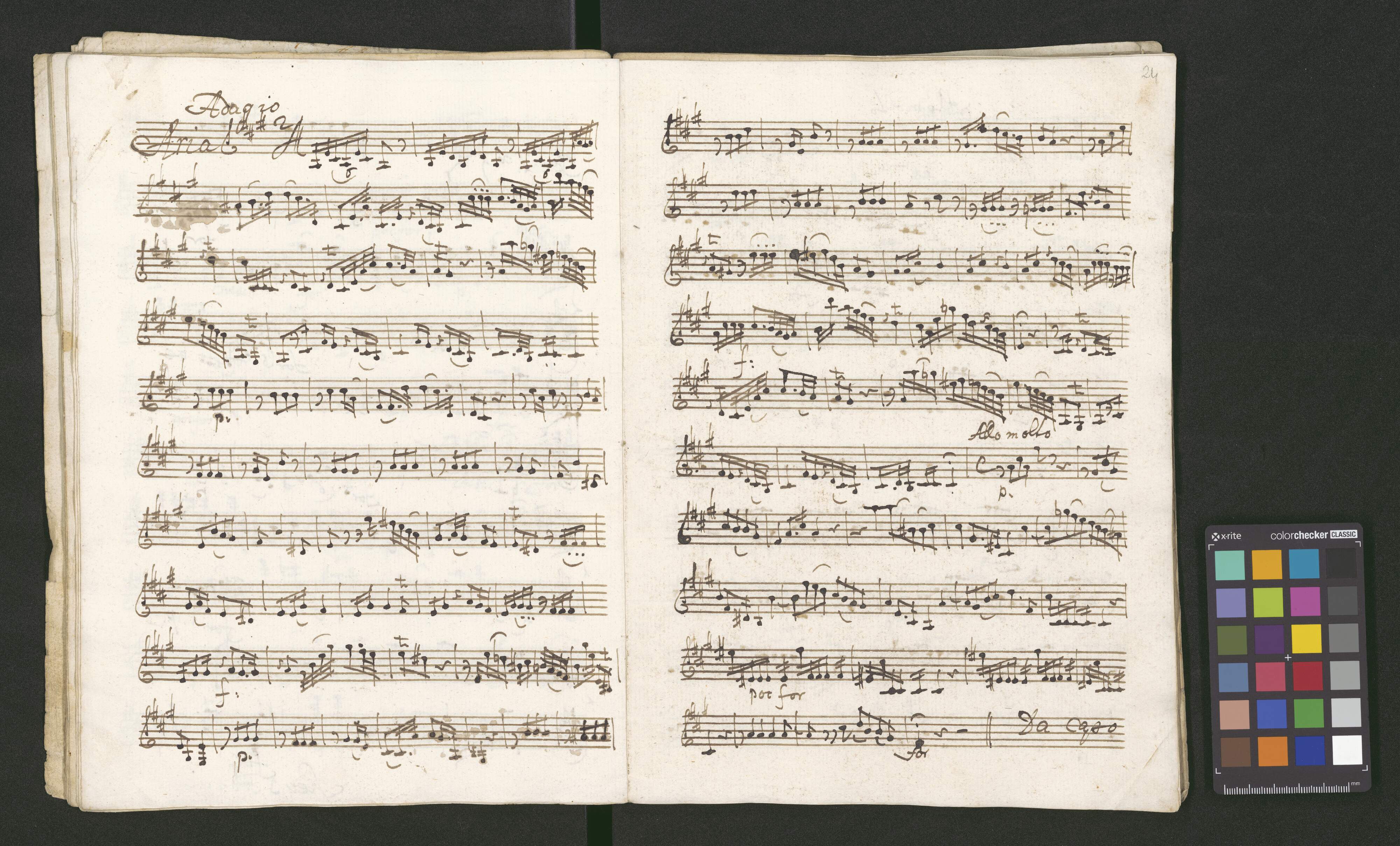 [in the upper left corner of the violone card:] Motetto a Soprano Con|to| [inte upper right corner:] A. T. B. ripirnio Violinis 2. Clarini 2 | Voiola Violoni Organo et Timpano. | Del S|re| Hoffman