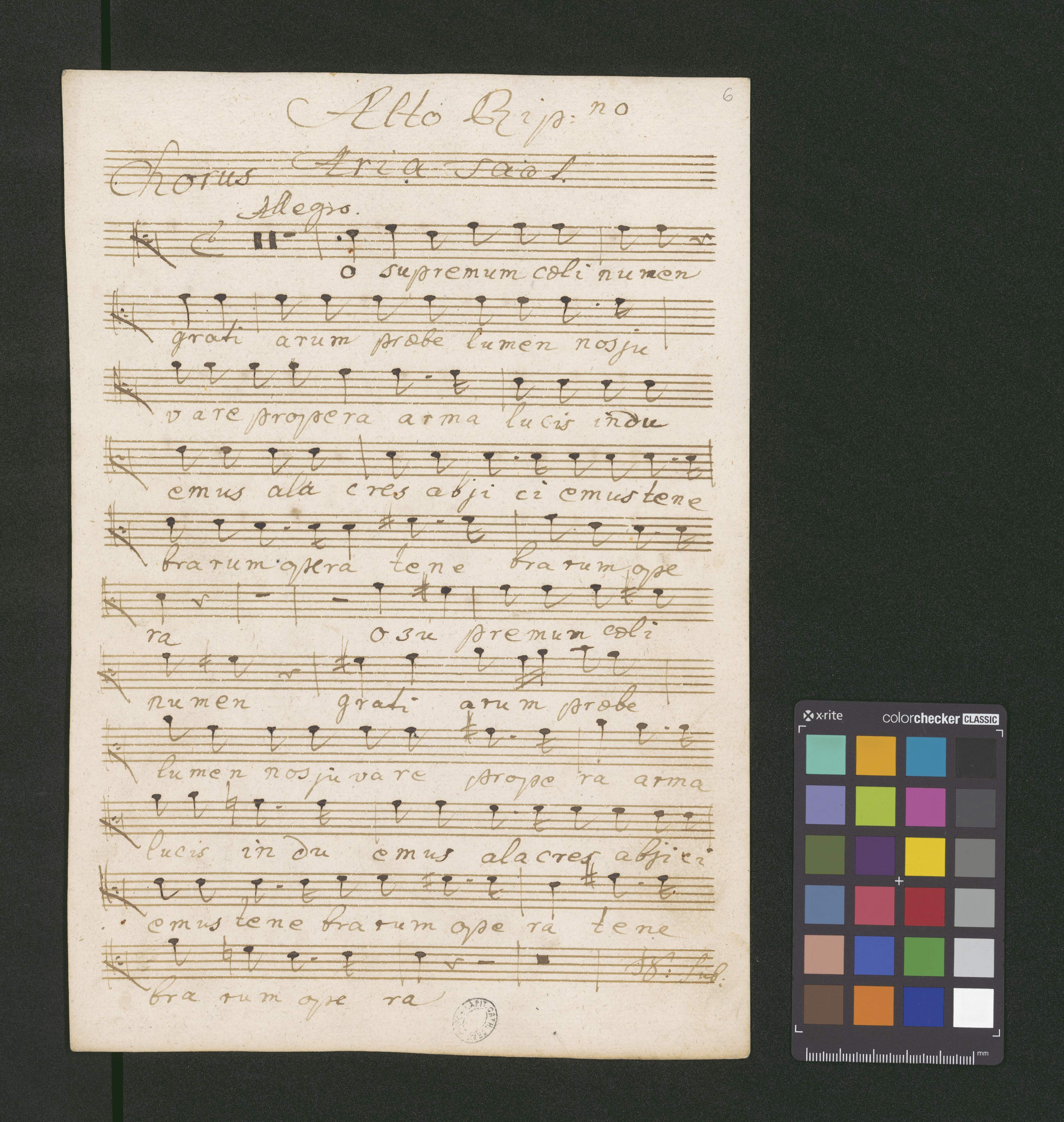 Motetto. | a | Soprano con|to| | 4 Voci Rip:|ni| | 2 Violini | 2 Oboe | 2 Clarini e Tympano. | Organo, con Violone | Del Sig:|re| Leopoldo Hofmann