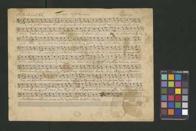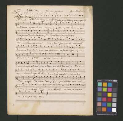 4 Offertories, [pl-text: Pieczęć: „ARCHIWUM I BIBLIOTEKA”, „Krakowskiej Kapituły Katedralnej” na ostatniej stronie rękopisu. Pieczęć: „CATH. CRAC. * ARCH. CAPIT.” pojawia się siedem razy, u dołu lub u góry stron.], [pl-text: Foliacja naniesiona ołówkiem. Na stronie 9 pod numerem "5" widoczny (również zapisany ołówkiem) nuemr"1".], [pl-text: Na drugiej stronie w lewym górnym rogu napis ołówkiem "N 118".], [pl-text: Na prawym brzegu strony 2 i 4 nadrukowane obok pięciolinii "Nro. 334.".], [pl-text: Karta partii B (strony 7-8) ma odcięty niemal w całości dolny brzeg. Na stronie 8 widać zapisane atramentem rachunki.]