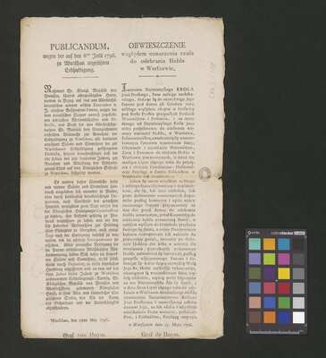 [pl-text: W sygnaturze zachowana jedynie karta tytułowa/okładka.], [pl-text: Okładka (z k. tytułową) sporządzona ze złożonego na poł obwieszczenia. Na odwrocie k. tytułowej widoczne zadrukowane w dwóch językach (po niemiecku i po polsku) "OBWIESZCZENIE | względem oznaczenia czasu | do odebrania Hołdu | w Warszawie." z umieszczoną na końcu datą "w Warszawie dnia 15. Maja 1796." oraz podpisem "Graf de Hoym.".], [pl-text: Foliacja na k. tytułowej (f. 1r) naniesiona ołówkiem.], [pl-text: Czarna pieczęć: „CATH. CRAC. * ARCH. CAPIT.” na odwrocie k. tytułowej.], [pl-text: Na stronie z obwieszczeniem na prawym marginesie zapisana ołówkiem sygnatura.]
