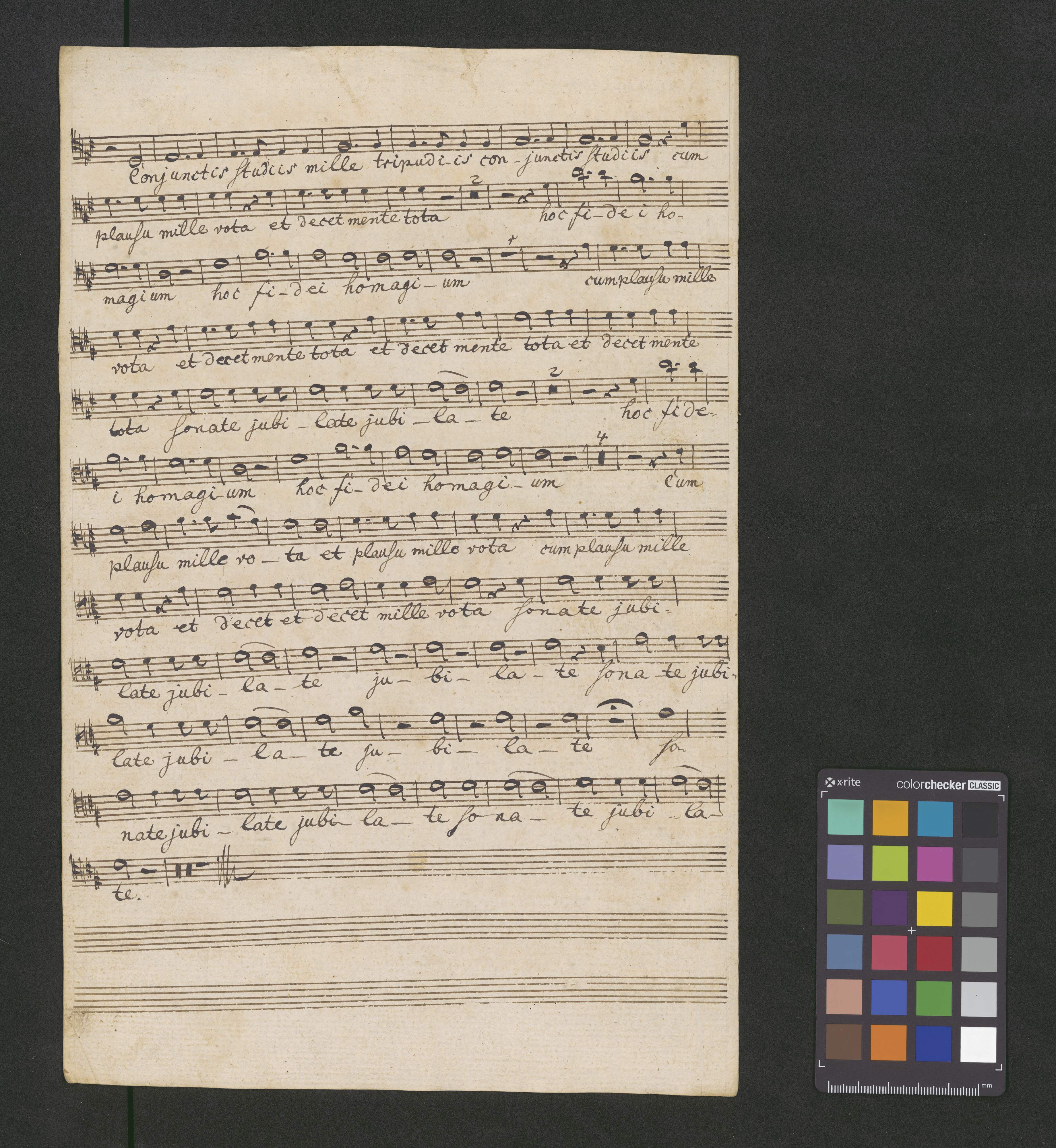 [title page:] Offertorium | a | Vocibus 4. C.A.T.B. | 2. Violinis. | 2. Clarinett. | 2. Fagot. | 2. Corni. | 2. Clarini. | Tympanis | Viola dua Alto. | Cum | Organo. | W. Mozart. | Chori Gaudensis