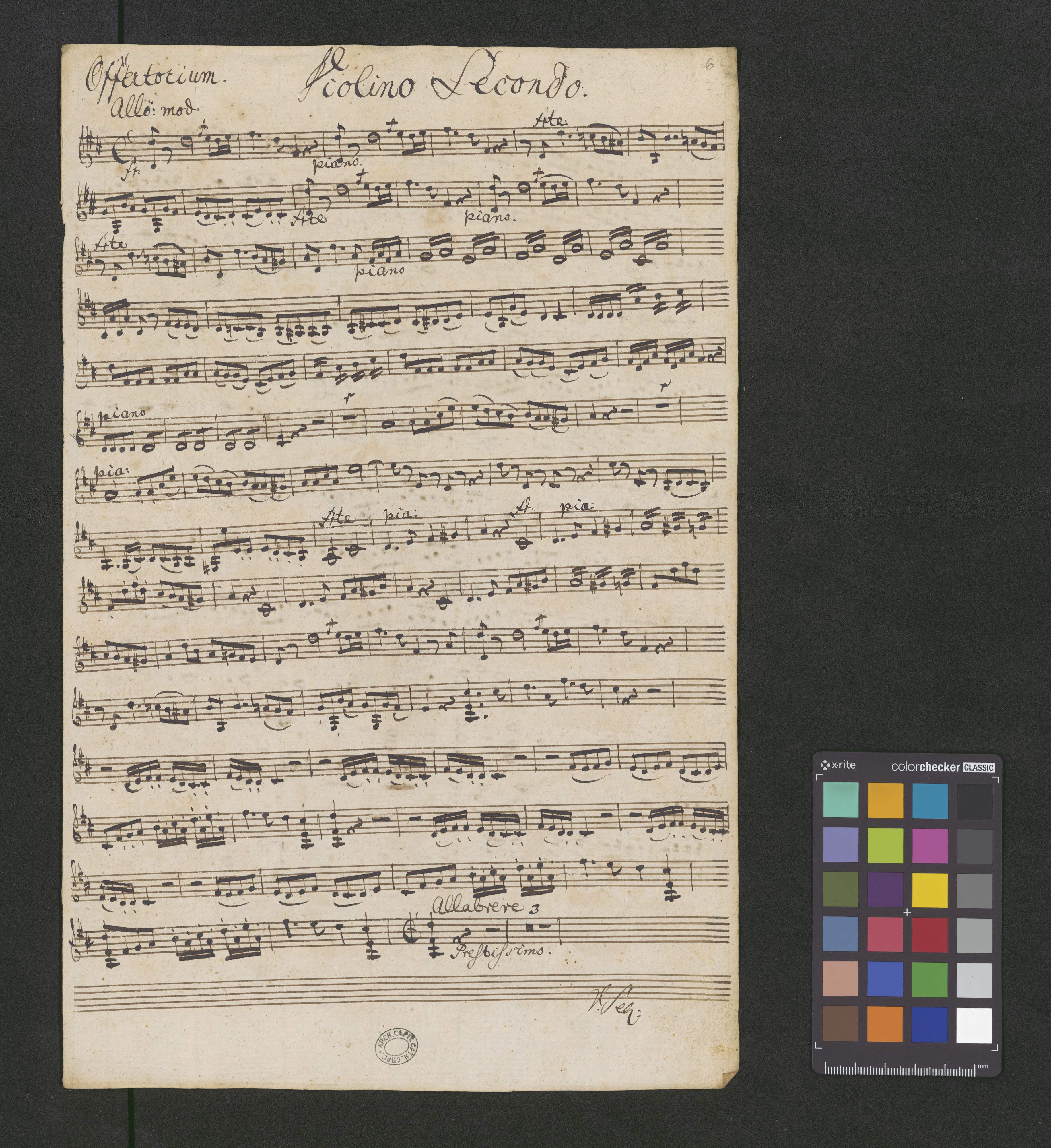 [title page:] Offertorium | a | Vocibus 4. C.A.T.B. | 2. Violinis. | 2. Clarinett. | 2. Fagot. | 2. Corni. | 2. Clarini. | Tympanis | Viola dua Alto. | Cum | Organo. | W. Mozart. | Chori Gaudensis