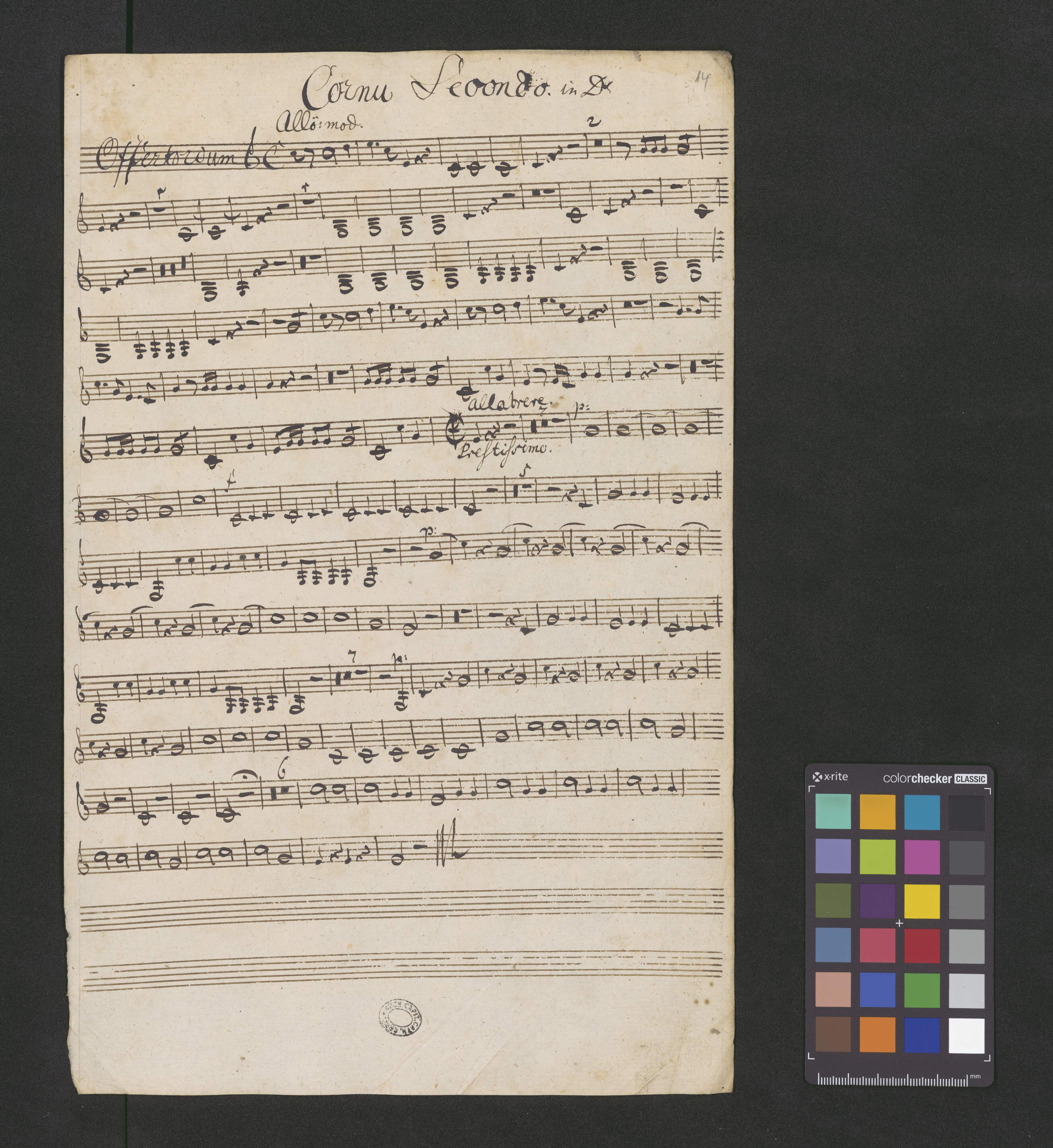 [title page:] Offertorium | a | Vocibus 4. C.A.T.B. | 2. Violinis. | 2. Clarinett. | 2. Fagot. | 2. Corni. | 2. Clarini. | Tympanis | Viola dua Alto. | Cum | Organo. | W. Mozart. | Chori Gaudensis